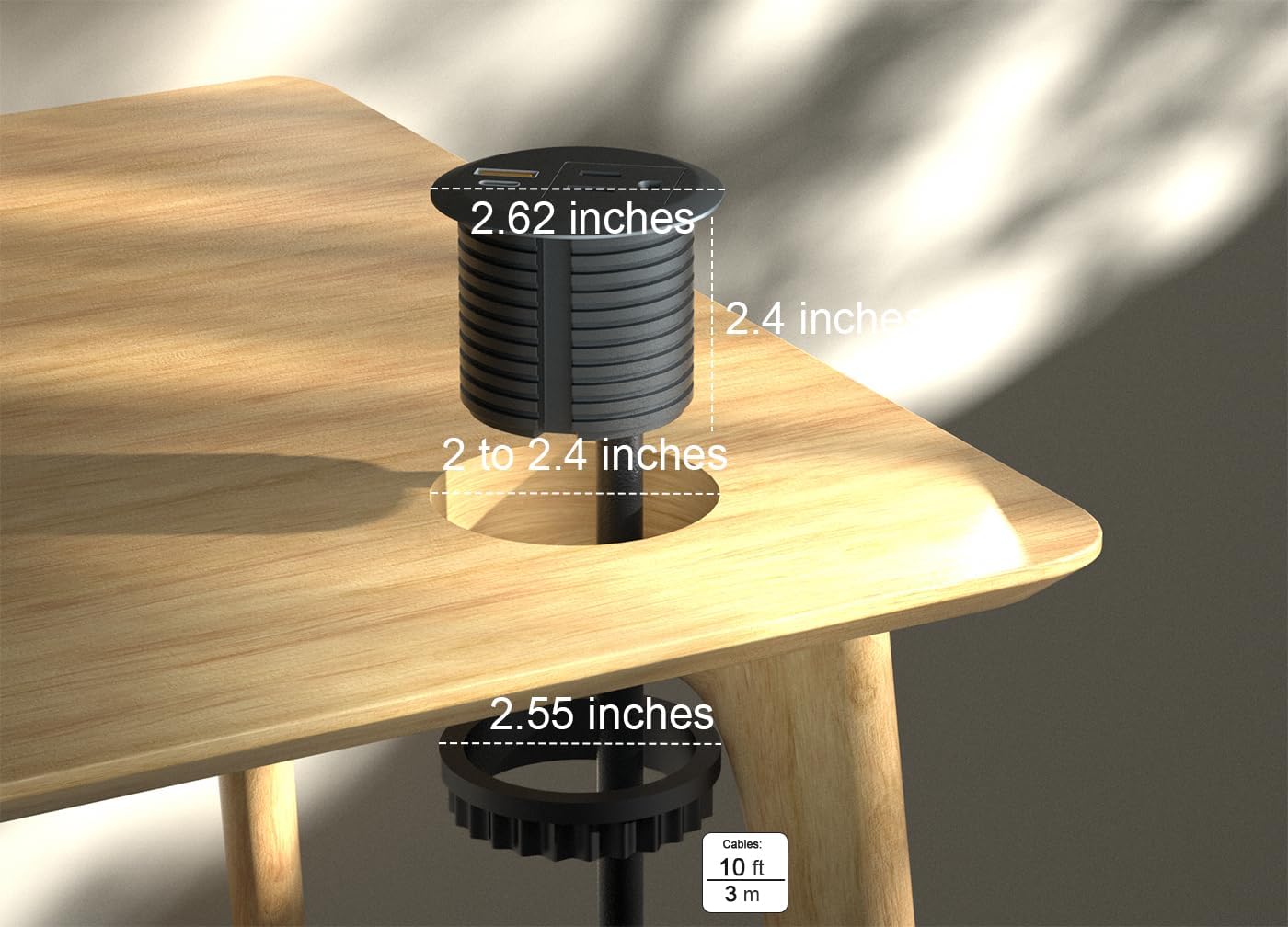 - All-in-One Recessed Power Outlet - 1 AC outlet,1 USB-A port,and 1 USB-C port power everything on your desk from a single recessed power grommet,9.71 ft extension cord