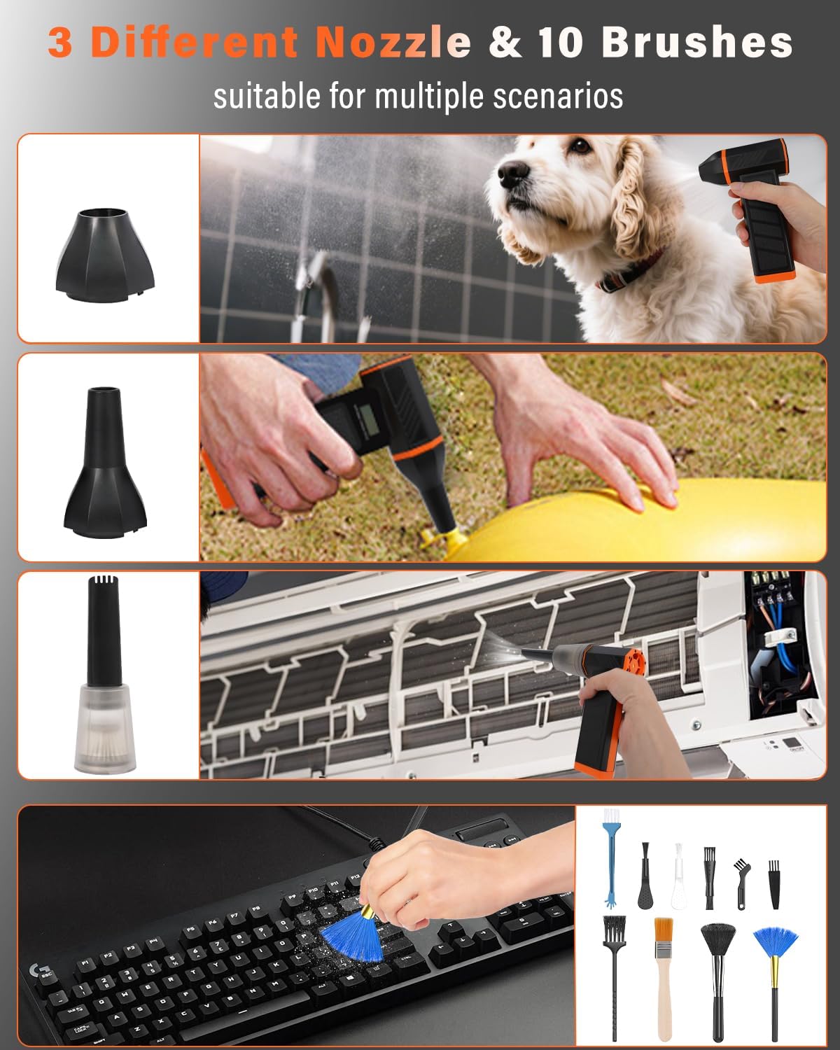 - 【Complete Cleaning Kit】Cordless air duster comes with a full accessory set including long and short nozzles, multiple brushes, and a specialized dust extraction nozzle. The versatile attachments handle everything from tight spaces to large surfaces, offering a complete cleaning solution. All tools store conveniently together for easy access.