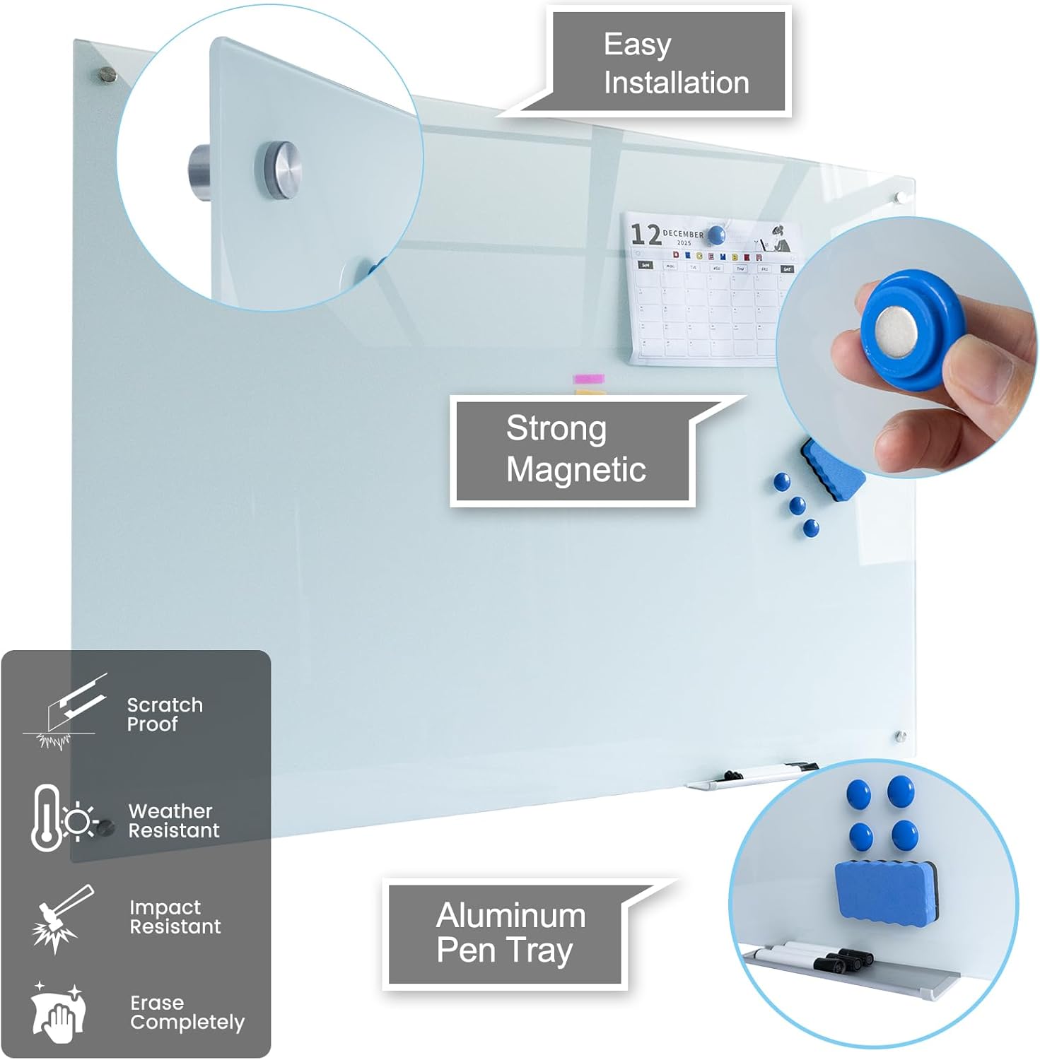 - ACCESSORIES INCLUDED – Measures 48" x72". Comes with removable accessory tray, 1 Magntic Wraser,2 markers and 2 high power glass board magnets.