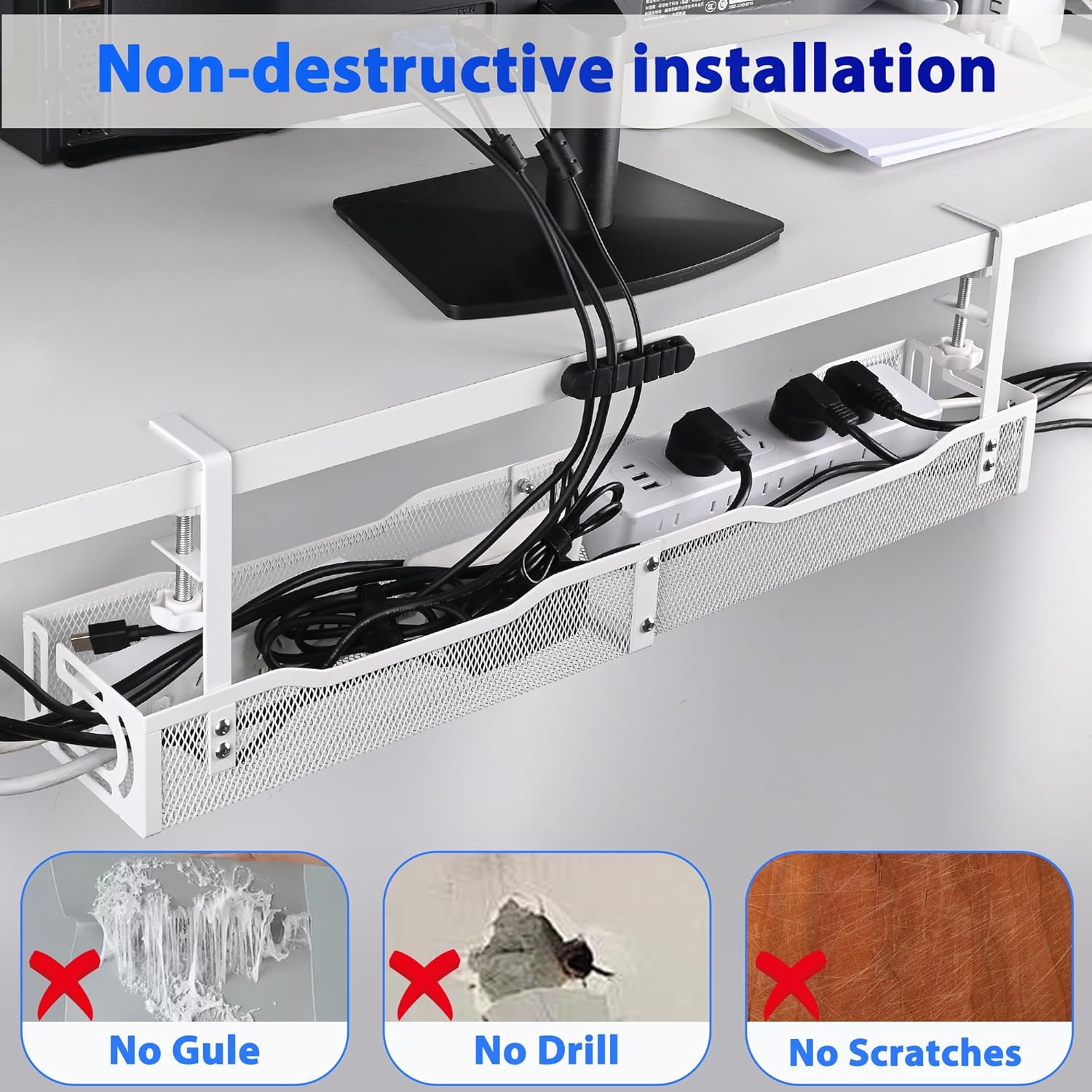 Under Desk Cable Management Tray 25.3 Inch – No Damage Install, Cord Organizer for Office & Home, Wire Organizer for Desk Storage, White