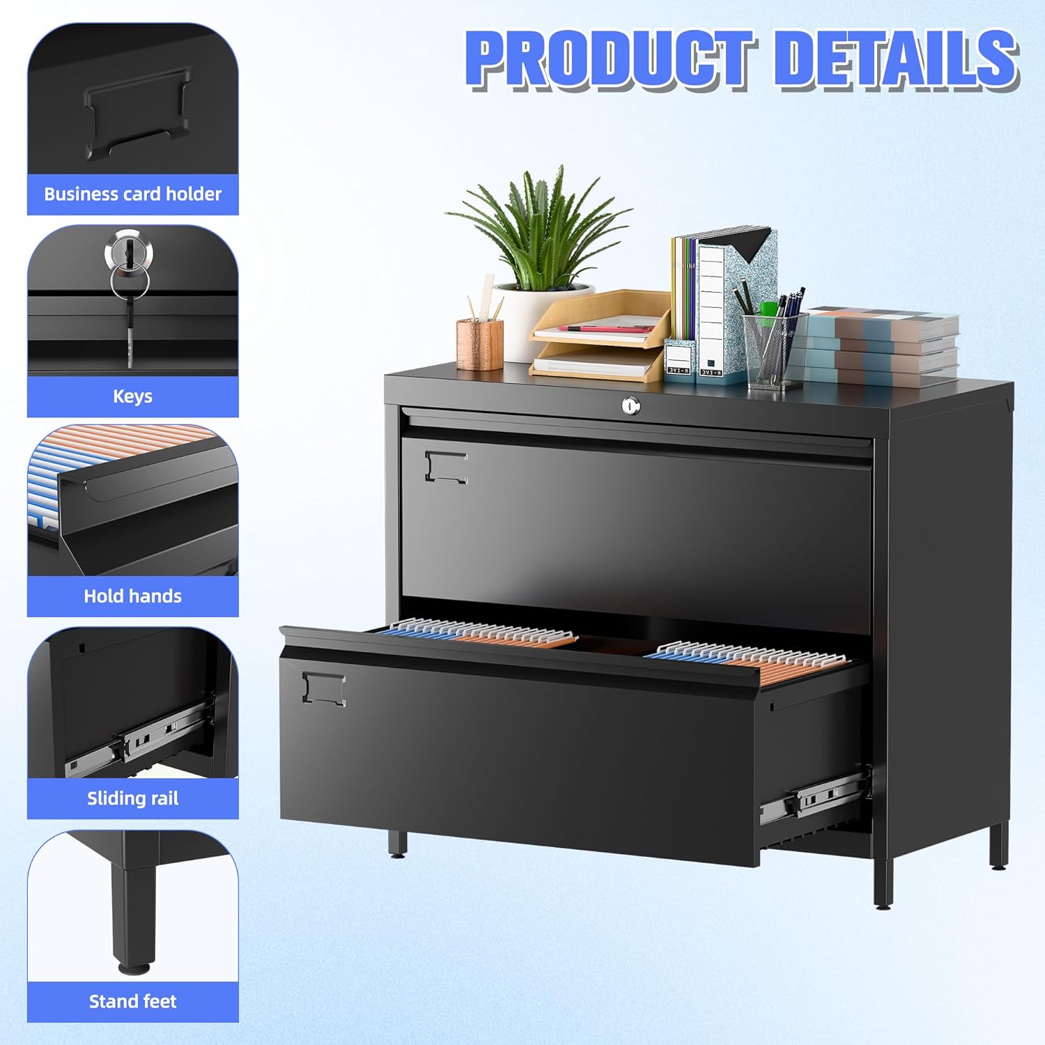 - Durable Steel Construction & Scratch-Resistant Finish:Built with heavy-duty solid steel, this lateral file cabinet delivers reliable stability for home offices or professional workspaces. The smooth powder-coated surface resists scratches and fingerprints while allowing effortless cleaning—maintaining a sleek, modern look for years.