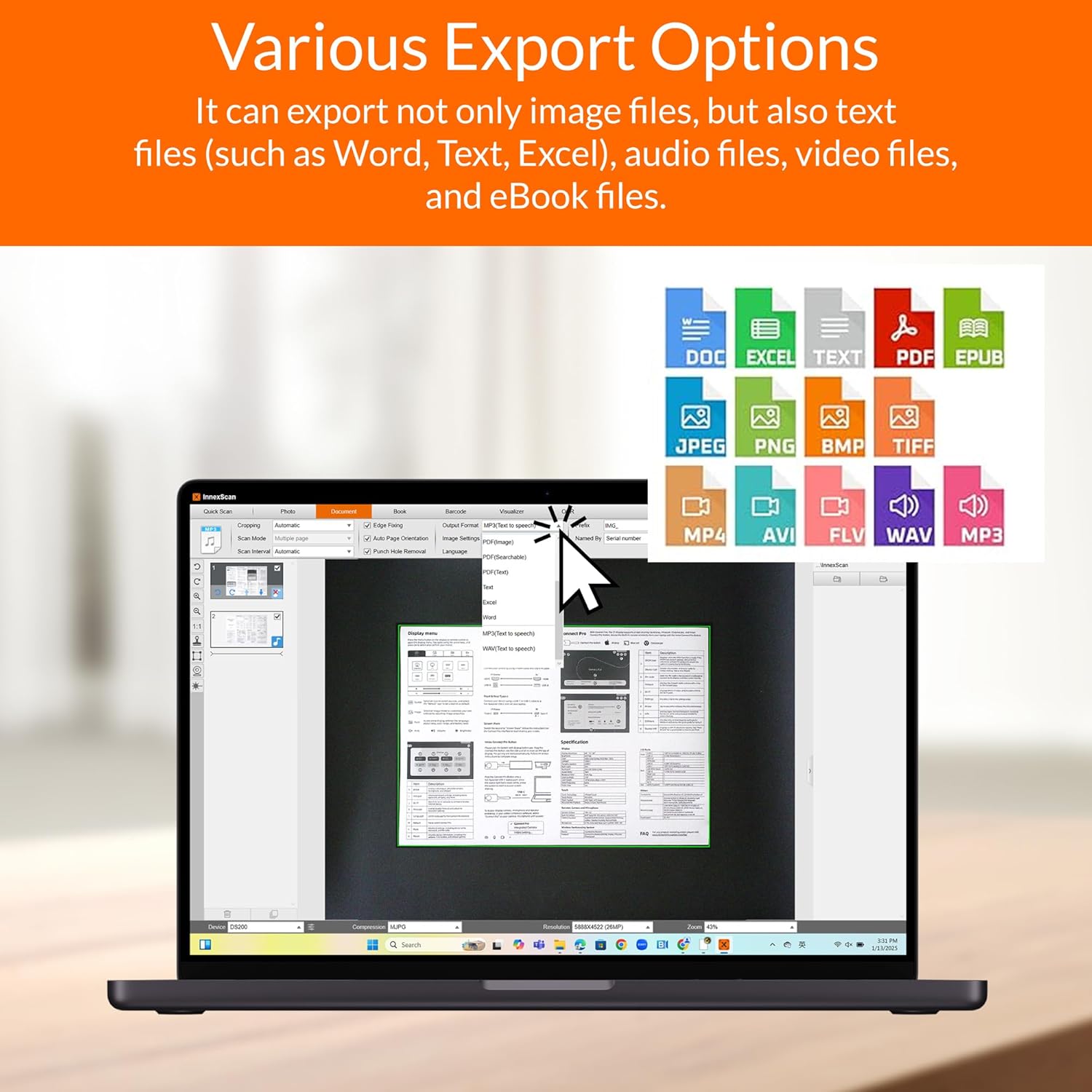 - Smart Software Features: Innex Scan software supports curve flattening, OCR, auto-cropping, page-turn detection, finger removal, and more for smooth workflow.