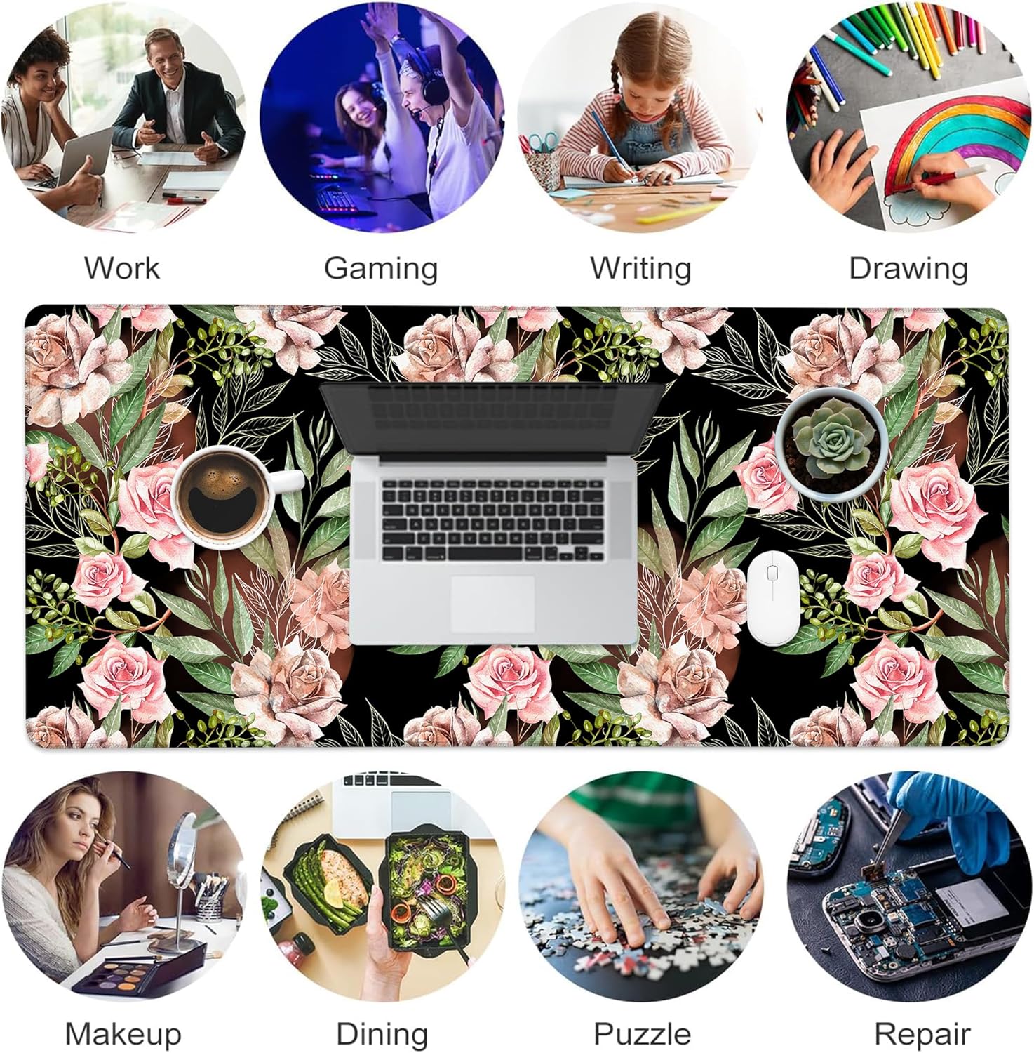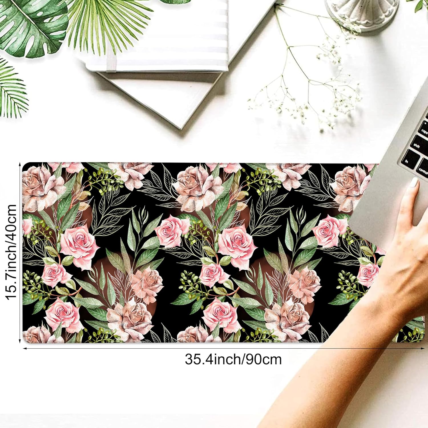 Desk Mat, Watercolor Rose Flowers Eucalyptus Leaves Large Gaming Mouse Pad with Non-Slip Base Stitched Edges,Desk pad for Keyboard and Mouse Home Office 35.4"x15.7"