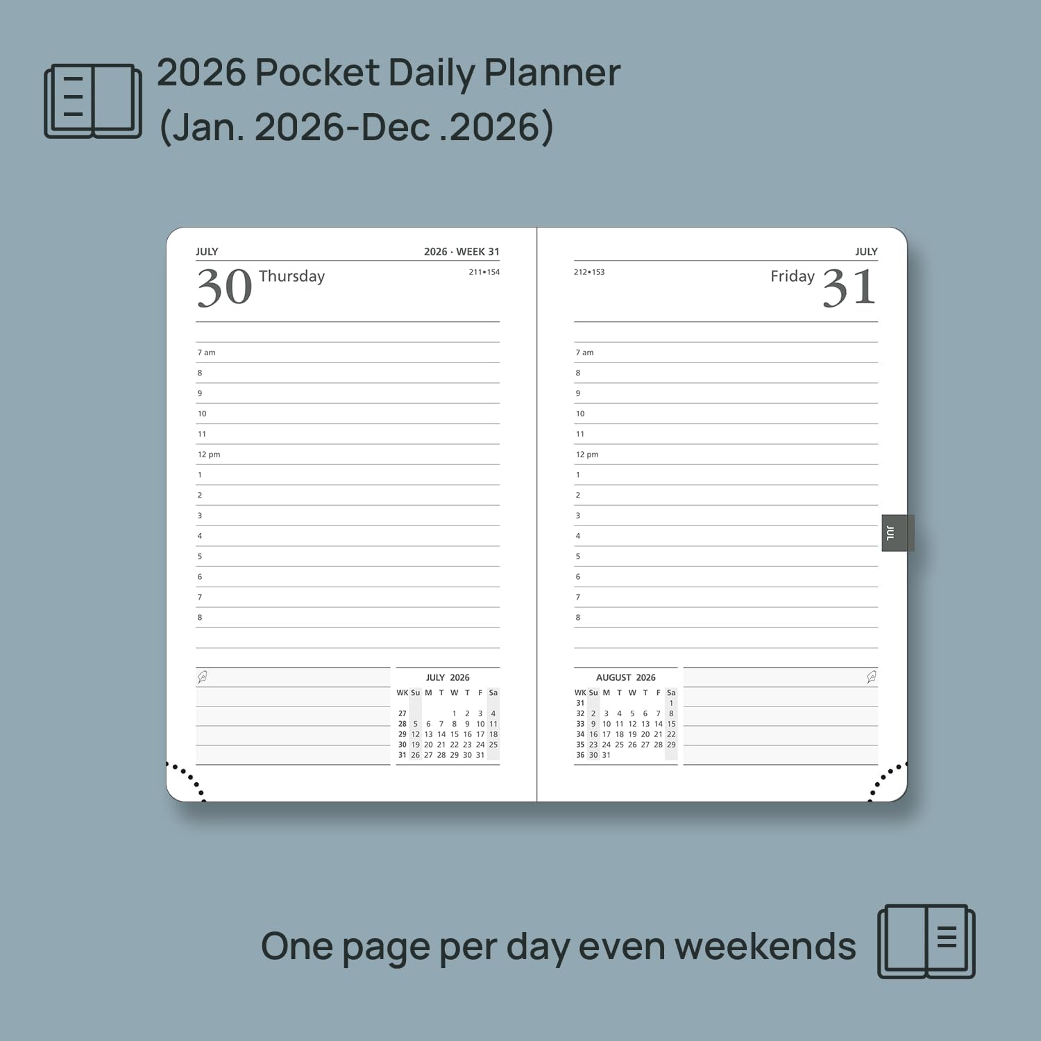 - ONE PAGE PER DAY, INCLUDING WEEKENDS - This daily planner offers 365 daily pages of year 2026, each with ample space for hourly scheduling. It keeps your busy daily routines organized and manageable.