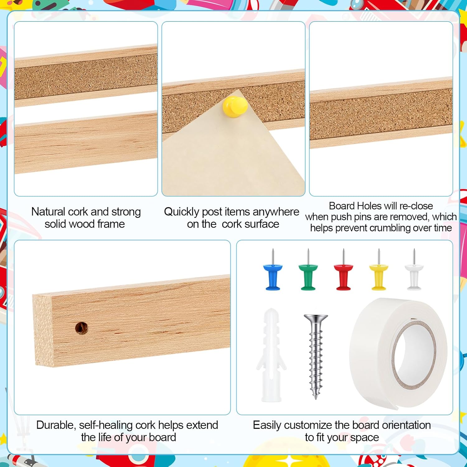 - Packing List: you can get 5 pieces of 48 inch long bulletin board strips, with 30 colored push pins, 10 screws, 10 bolts, and 5 rolls of tape; It provides you with two installation methods, allowing you to choose the method you like to fix the cork strips