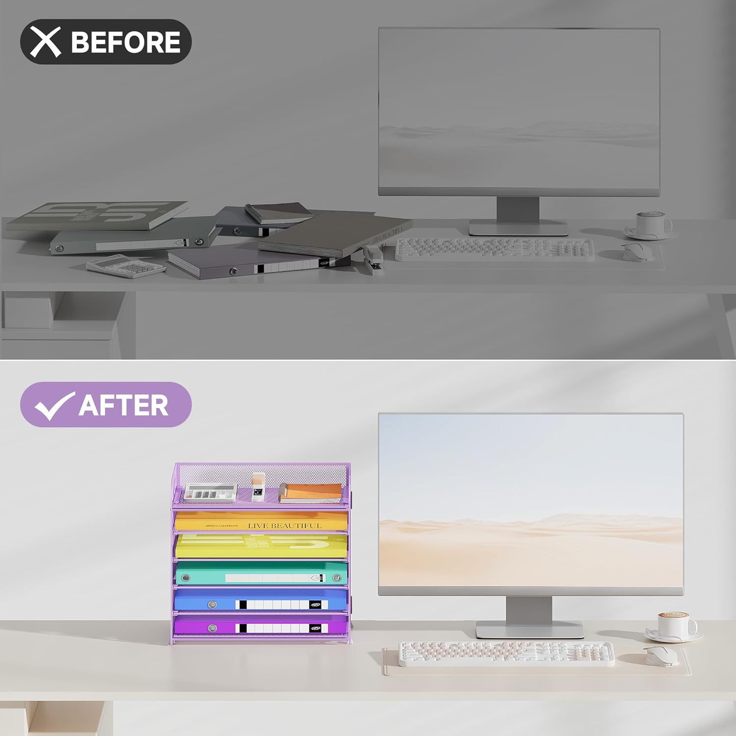 6 Tier Paper Organizer with Handle, Metal Desk Organizer Mesh Paper Letter Tray Desktop File Folder Document Sorter for Classroom, School, Office Accessories Organization and Storage - Purple