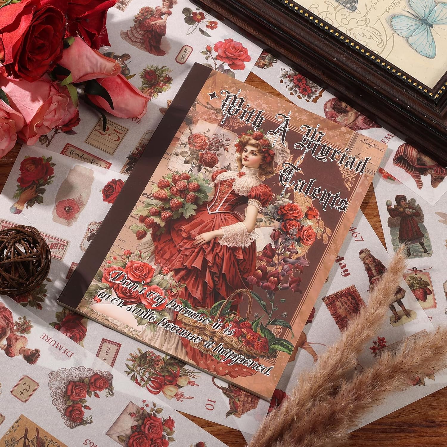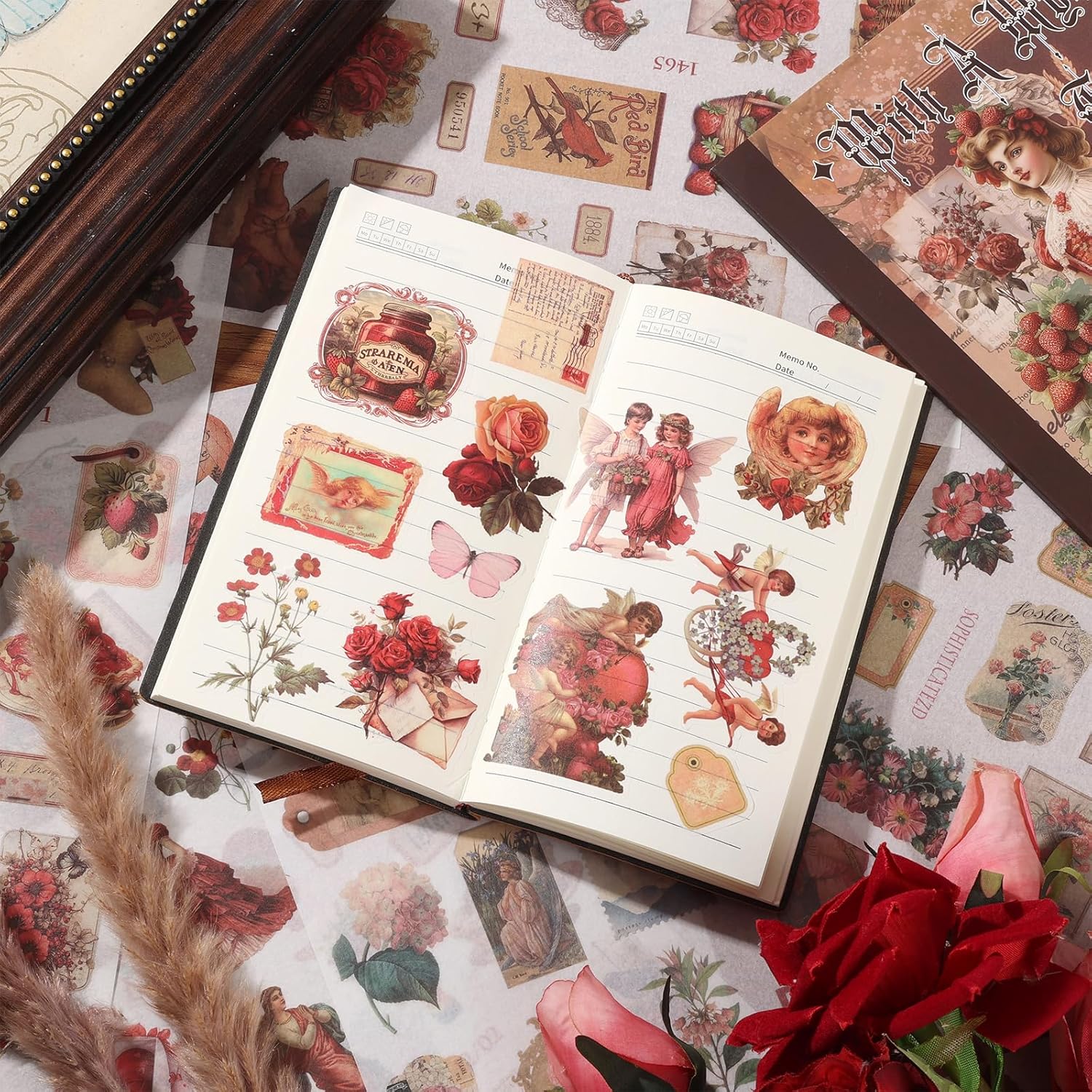 - Our vintage scrapbook stickers come in many different patterns, including women, girls, angels, butterflies, flowers, plants, roses, strawberries, mushrooms, labels, stamps, and text. You can use these stickers to make your scrapbook pages more personal. They will make your scrapbook more colorful, interesting, and attractive.