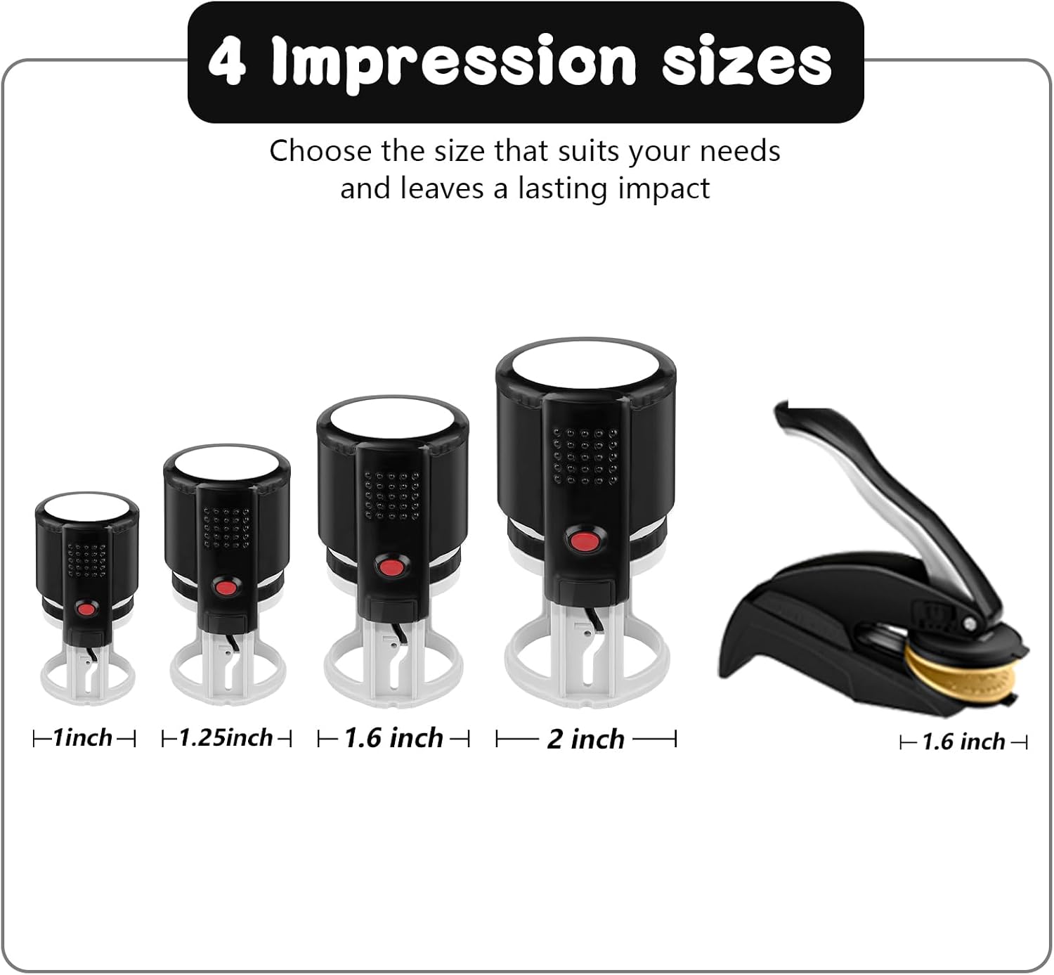 - š ćProduct Sizeć stamps are approximately 1.60" round impression area - this is standard for an Book Stamp. We offer Self Inking and Embossers.