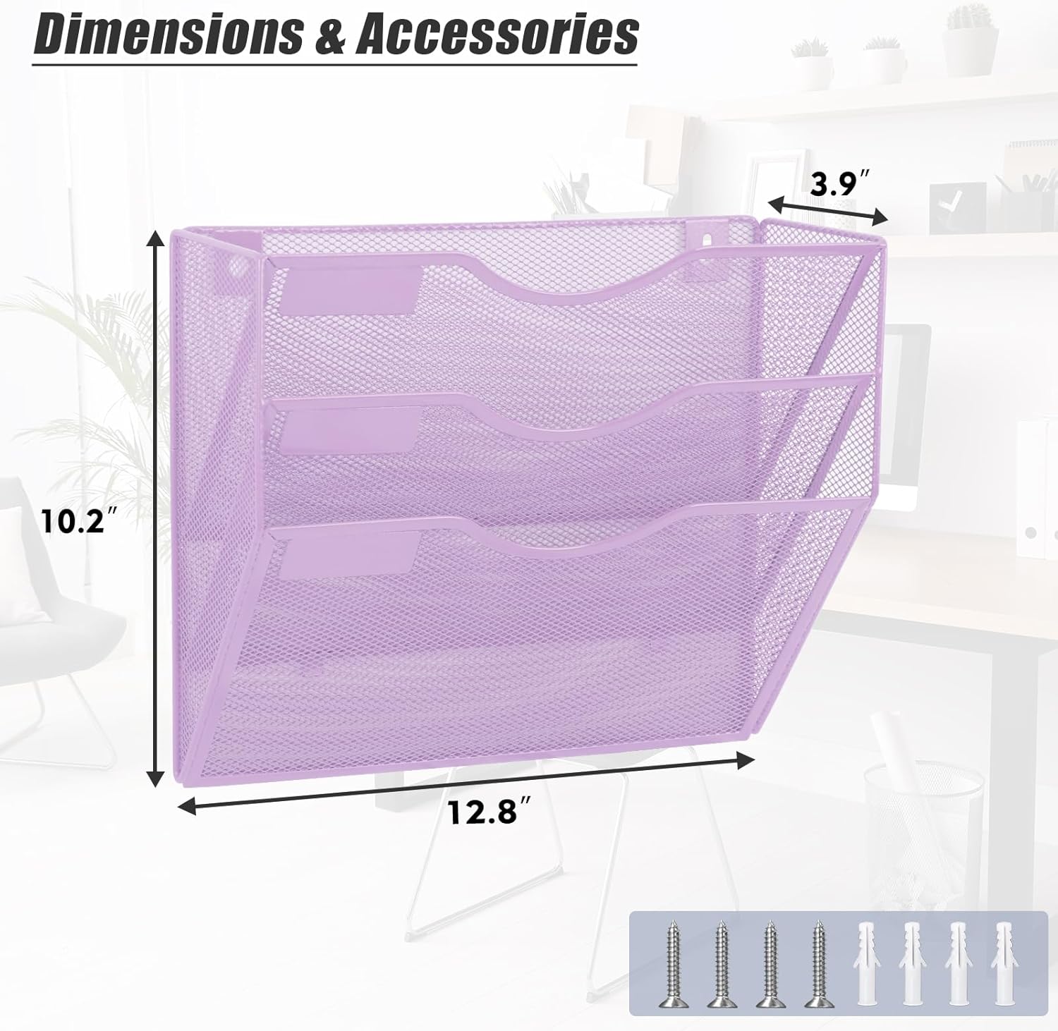 EASEPRES 3 Pocket Mesh Hanging Wall File Organizer, Wall Mounted Mail Paper Document Folder Holder, Clipboard Storage Organization Magazine Rack with Nametag Label for Office Home School, Light Purple
