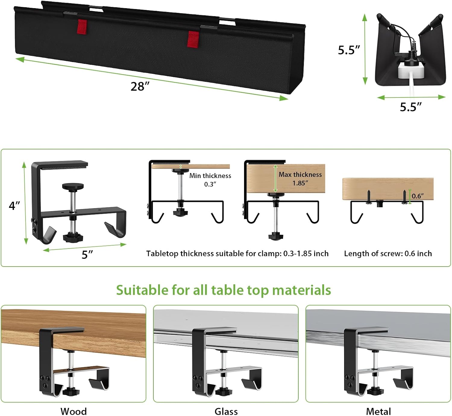 - [Easy Installation] - Installation is a breeze with the choice of clamp or screw mount support, ensuring a quick and convenient setup without the need for drilling. The sturdy construction of this desk wire management tray, along with 5 included fixed belt, makes it a durable and long-lasting solution for all your cord organization needs.