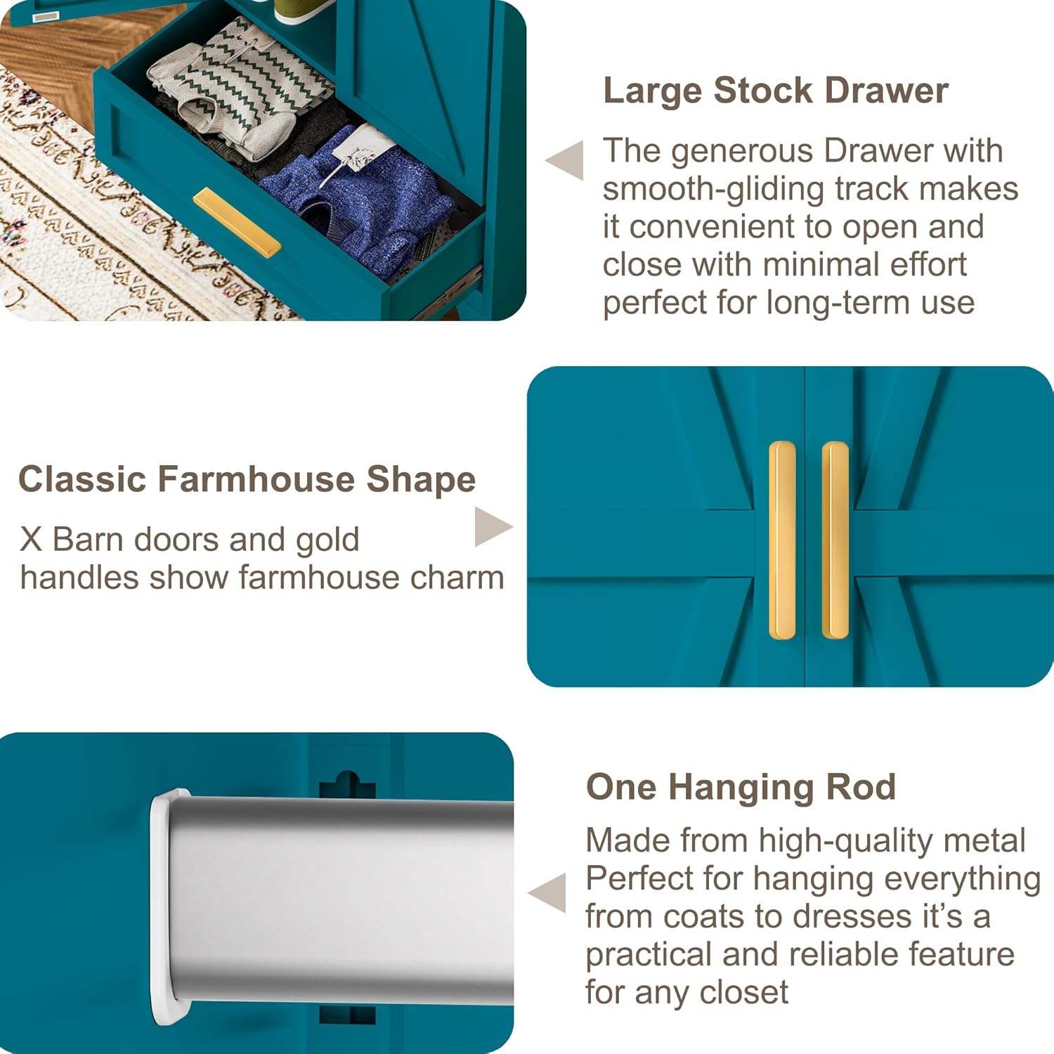 - Farmhouse-Style Aesthetic: The door panel of the metal wardrobe closet is designed with a charming farmhouse aesthetic, adding a touch of rustic elegance to your space. Storage cabinet has classic design complements a variety of decor styles, making it a versatile choice for any room