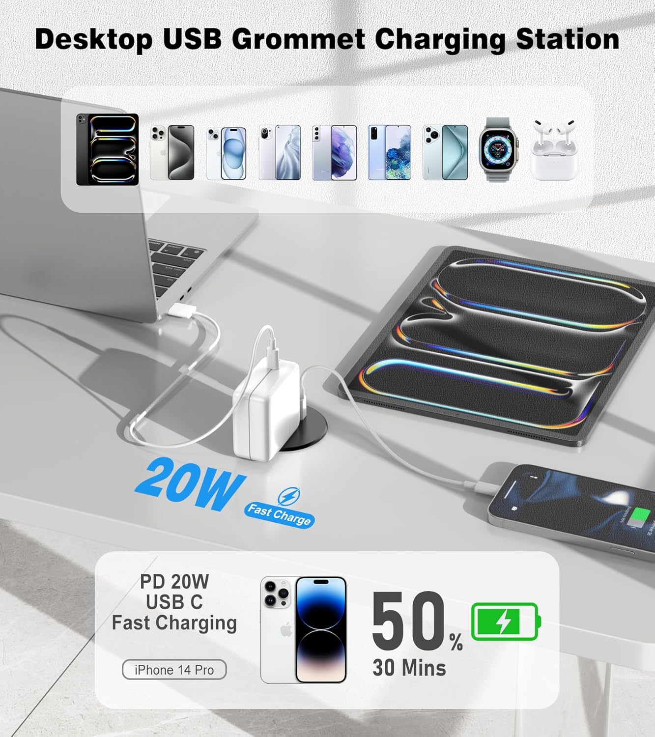 - 2.5in Desktop Grommet Outlet: 1 fast charging QC3.0 20W Max USB-A port and 2 PD3.0 20W Max USB-C ports. Come with 1 AC Outlets. Great addition to nightstand or furniture table.