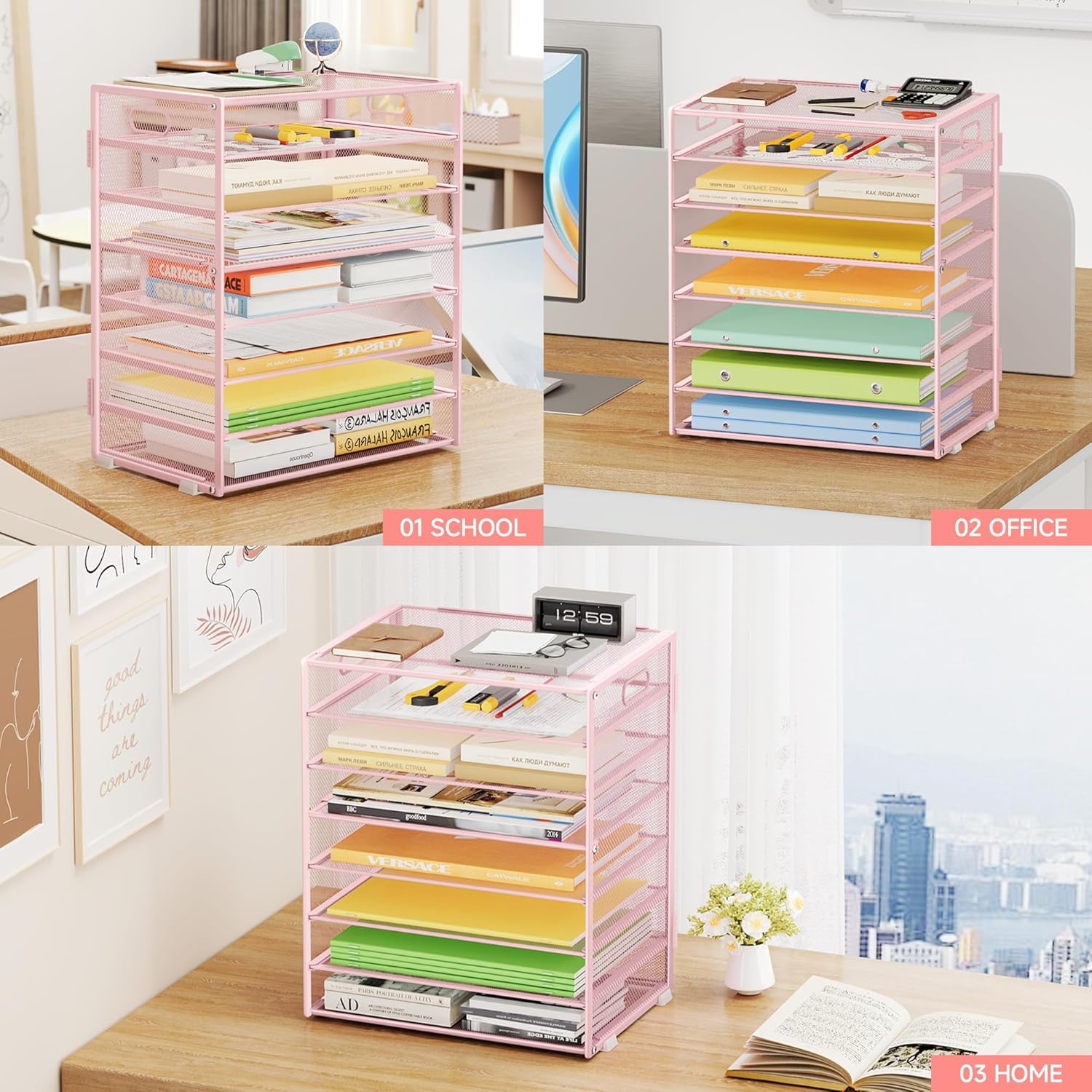 Paper Organizer with Handle Metal Mesh File Sorter Large Capacity Desk Organizers Paper Letter Tray Desktop Document Sorter for Office or Home2 Pack 8 Tier Pink Storage for Desk