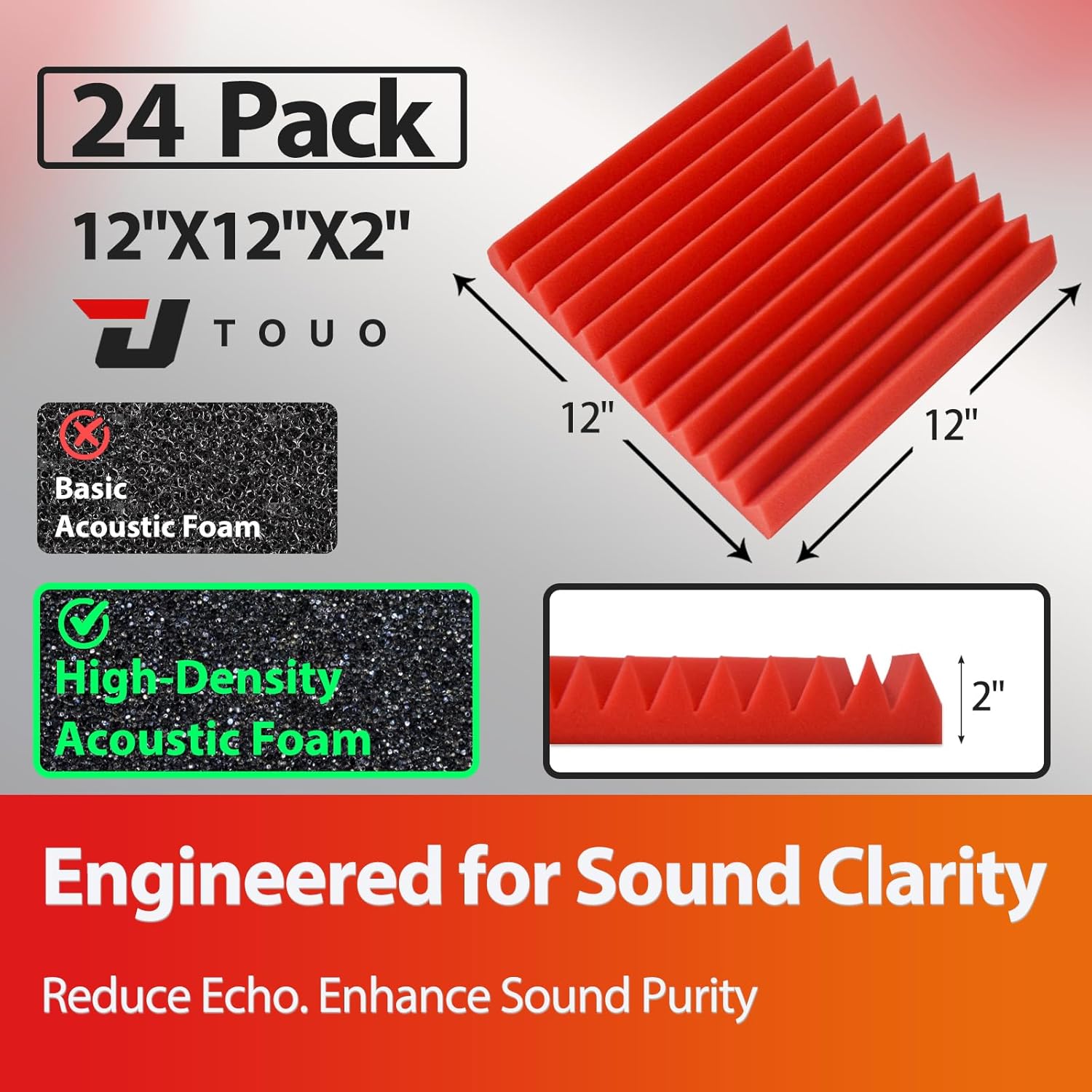 24 Pack Acoustic Panels – Sound Proof Foam Panels for Wall 12"x12"x2", Flame Retardant Wedge Acoustic Foam, High-Density Sound Absorbing Panels for Home Studio(Red, 2" Thick 24 Pack)