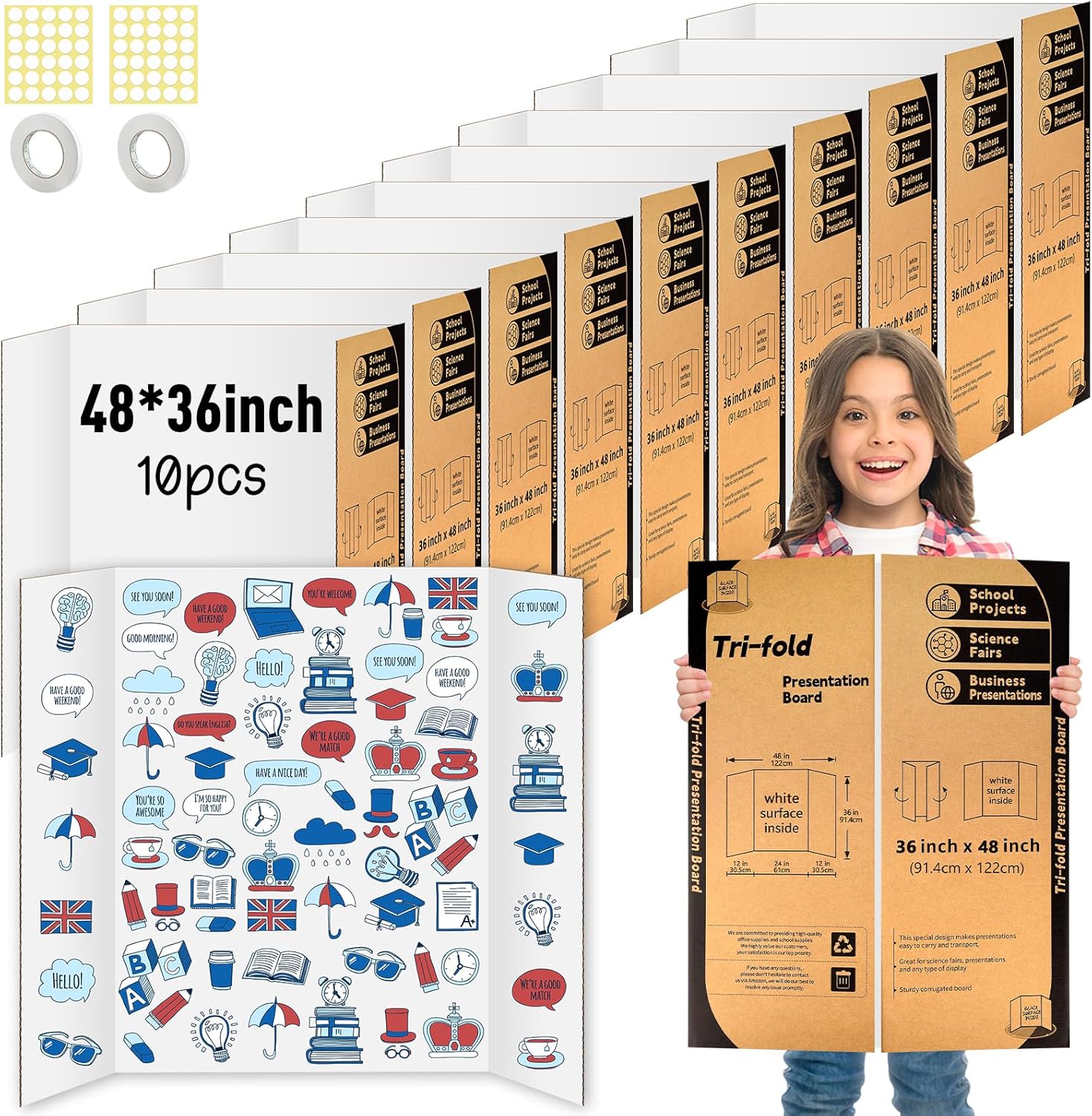 10 Pack Trifold Poster Board 48" X 36", IKAYAS Single sided White Poster Boards, Science Fair Display Boards Posterboard Foamboard for Mounting, Prints,Art,Display,Projects Classroom Supplies