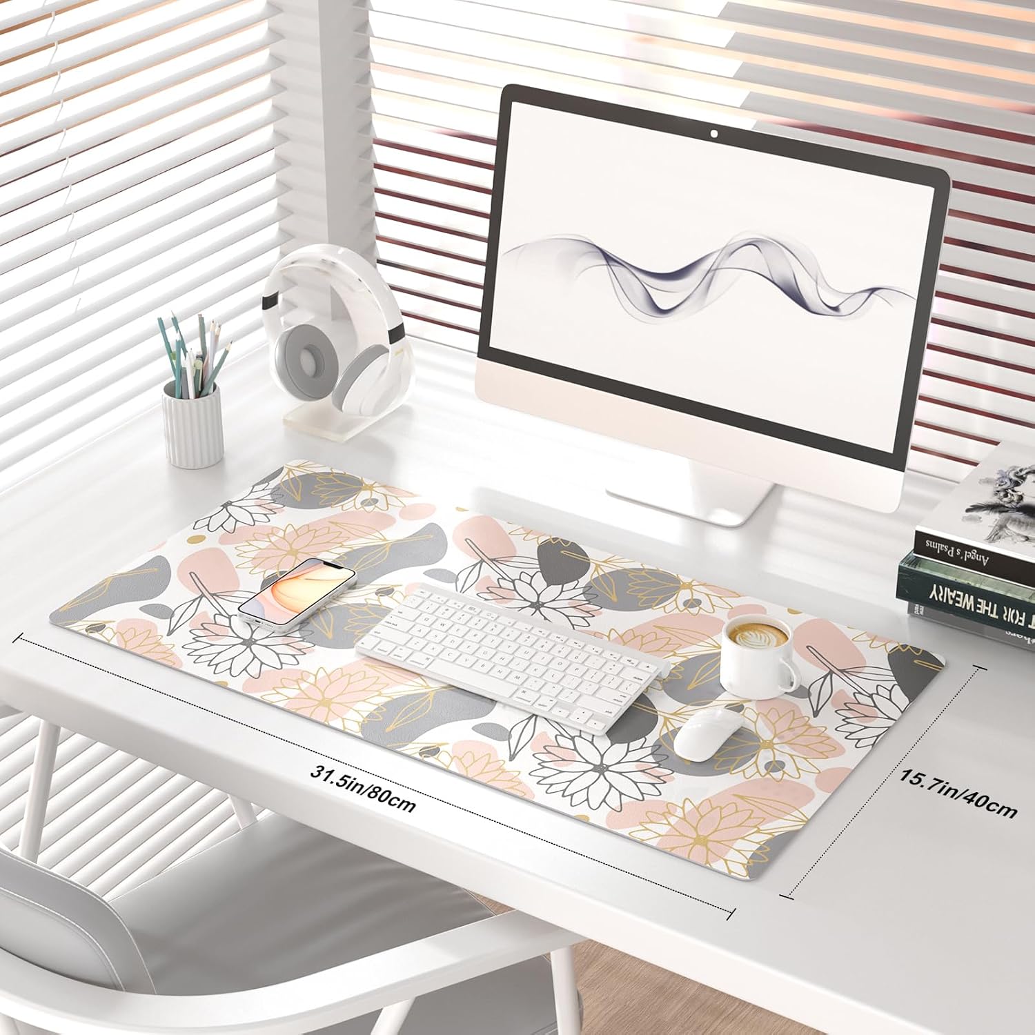 QiyI Large Mouse Pad, Extended Desk Mat for Desktop, PU Leather Waterproof Gaming Mousepad, Computer Desk Accessories Protector Writing Pads for School Office Home 31.5" x 15.7" - Line Art Flowers