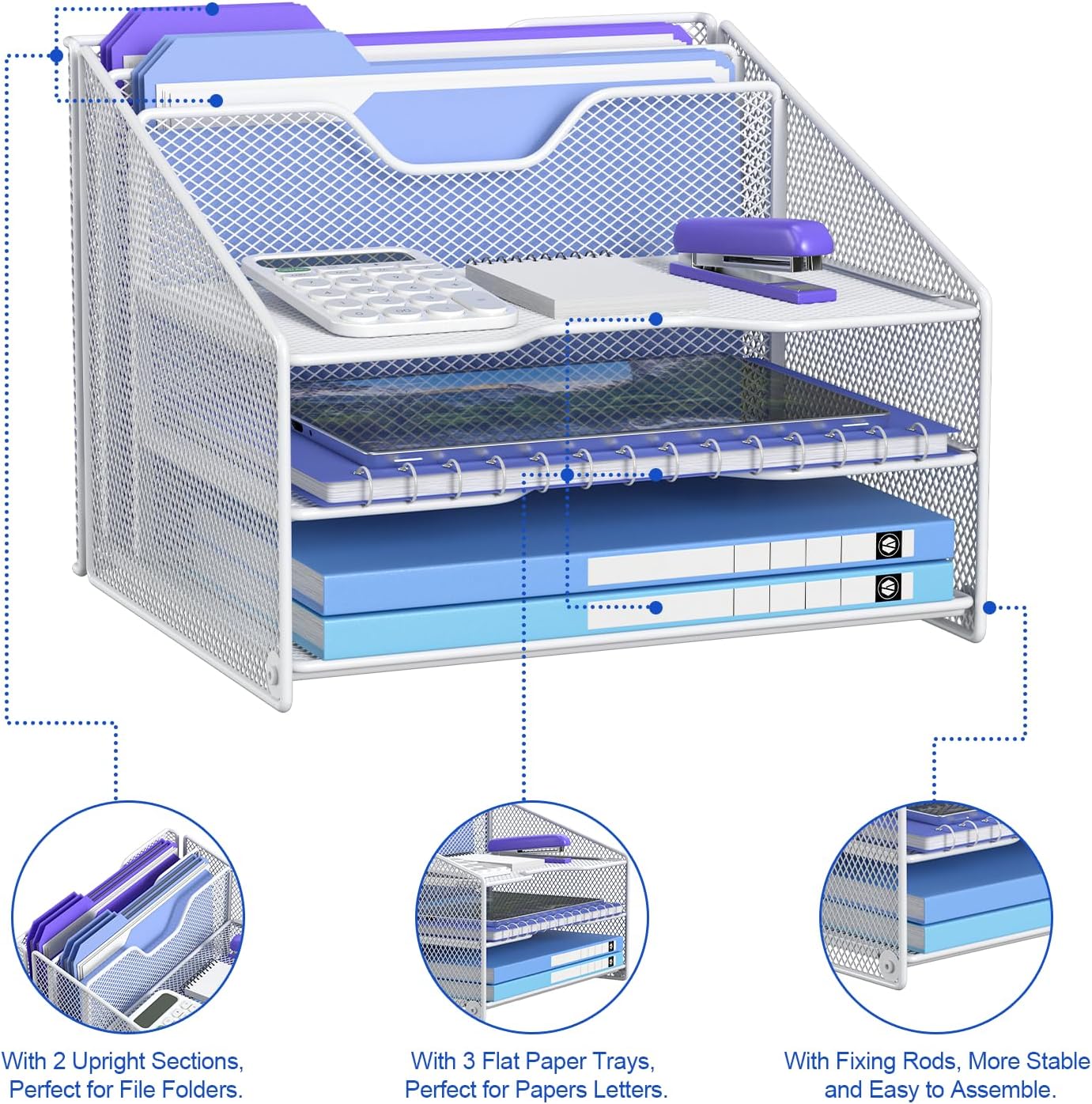 samstar White Desk File Organizer, Mesh Letter File Folder Holder with 3 Paper Trays and 2 Vertical Upright Section, for Office Supplies, Desk Accessories & Workspace, White