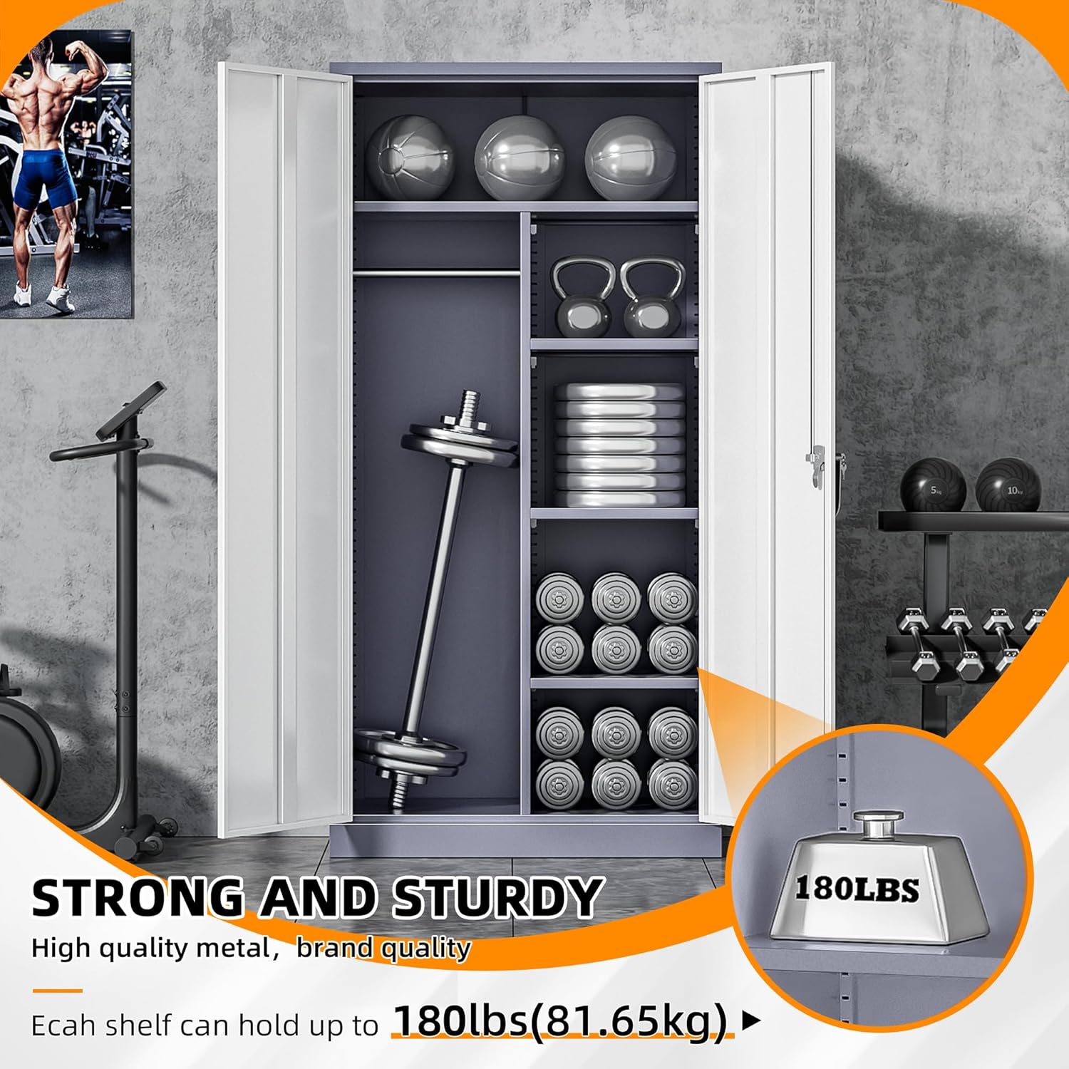 - 【Large Storage】: Locking metal locker cabinet with 4 shelves and a hanging rod can be used as both a storage cabinet and a clothes closet. The larger size (72''H x 36''W x18''D) fits your office, bedroom, bathroom, basement, warehouse