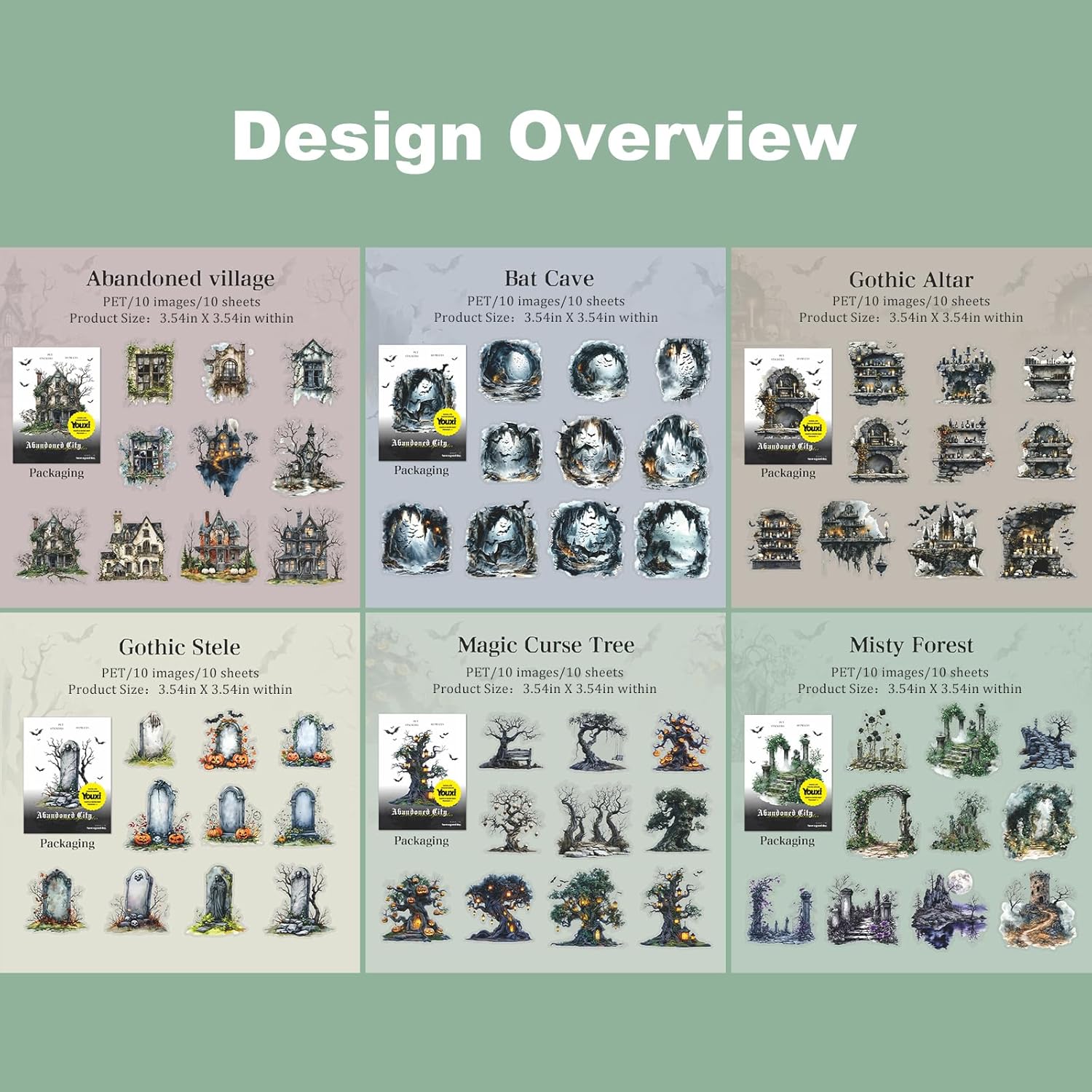 - Dark Abandoned City Design: This set includes 60 large PET stickers across 6 unique styles, featuring haunting scenes of crumbling buildings, tombstones, bare trees, lanterns, and bats to add a moody, mysterious atmosphere to your scrapbooks and journals