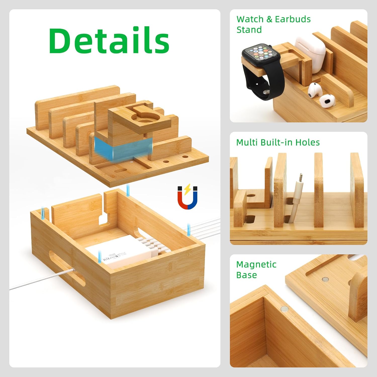 Bamboo Charging Station for Multiple Devices, Desk Wood Docking Station for Phones, Tablets, Watch, Earbuds, Charger Organizer Included 6 Cables & 5-Port USB Charger