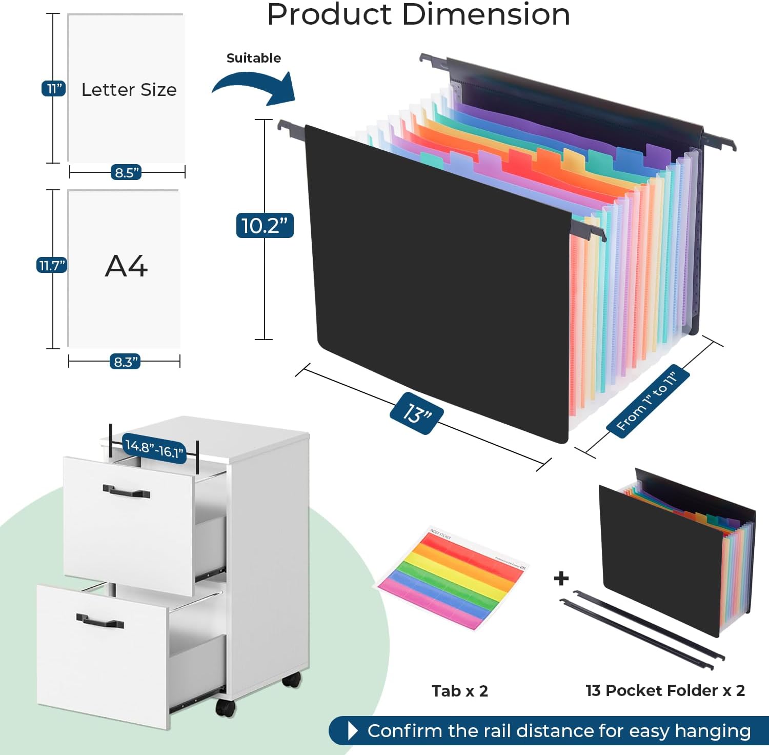 - Dimension - the hanger length: 16”, folder size: 13” W x 10.2” H. You will receive 2 pack of 13 hanging file folder(plastic hanger x4, plastic folder x2, tab x2). Perfect for school, home, and office use