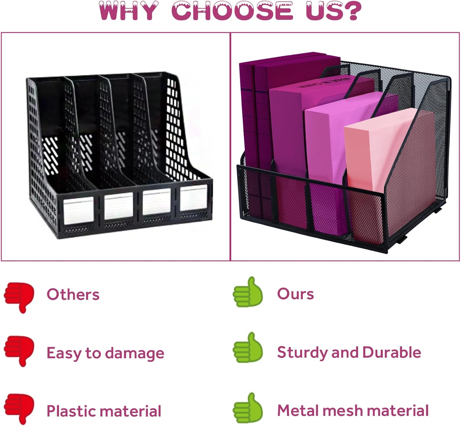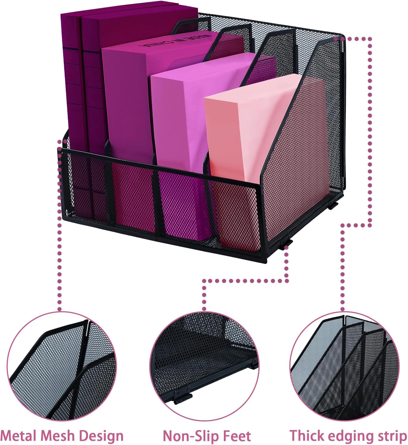 - 📚High Quality: Desk organiser is made of high quality metal materials, it has a strong metal construction and durable powder coat finish, sturdy and durable, with smooth and burr-free edges