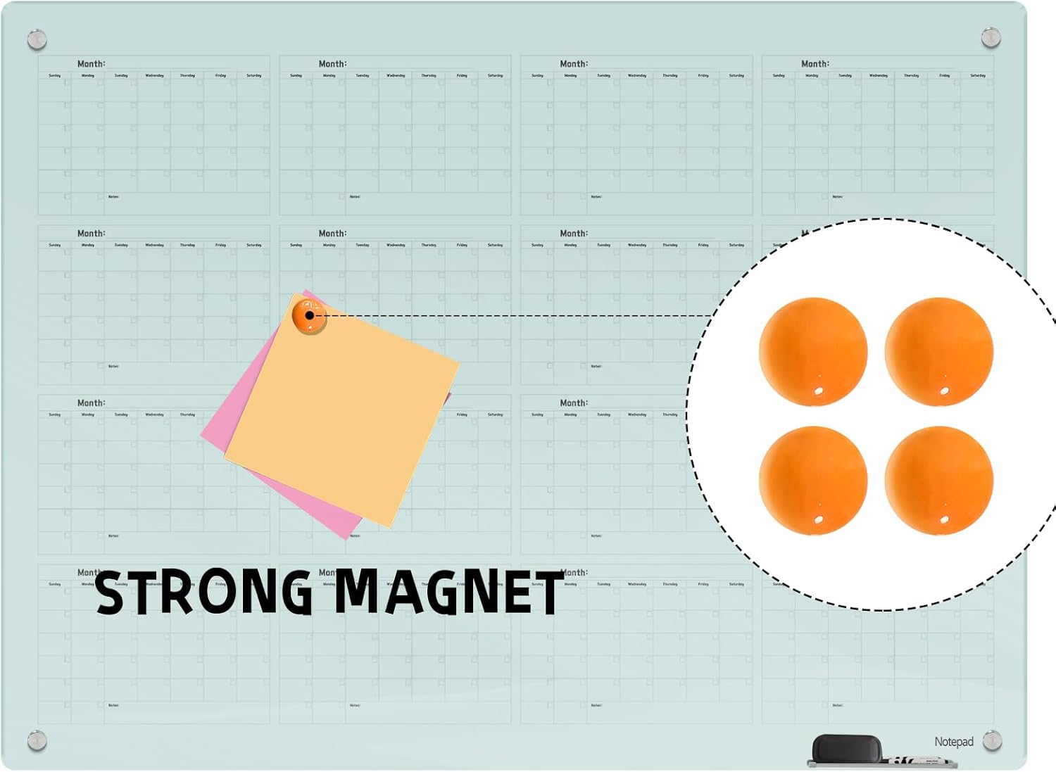 Magnetic Glass Dry Erase Board Calendar- White Board 48 x 36 Inch Wall Mounted Yearly Whiteboard, Large Frameless Glass White Board for Wall Office, Home & School