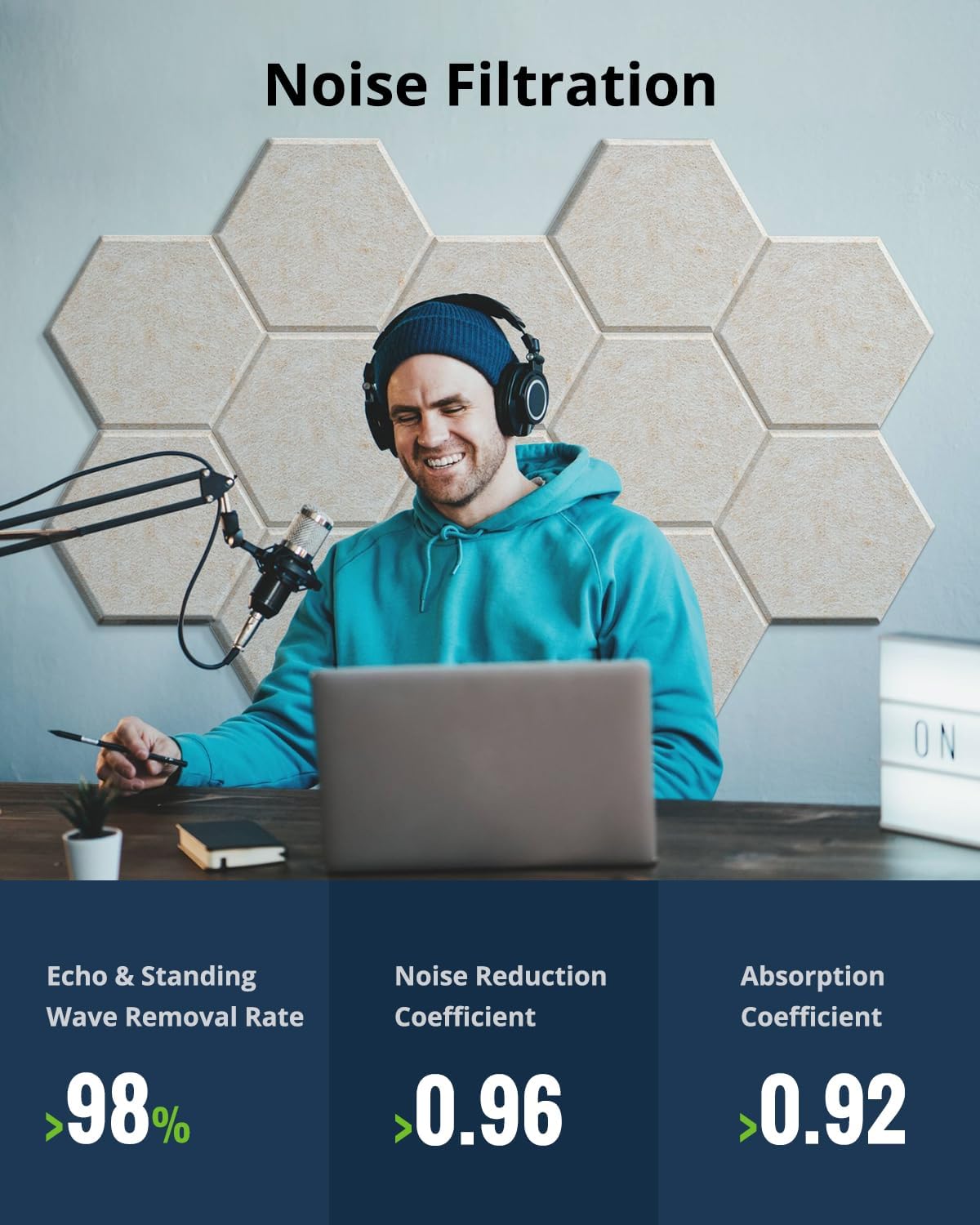 12 Pack Acoustic Panels Sound Absorbing, Self Adhesive Sound Proof Panels, Hexagon High Density Sound Deadening Panels, 12"X10"X0.4" Wall Decor for Bedroom,Home,Studio,Office(Beige)