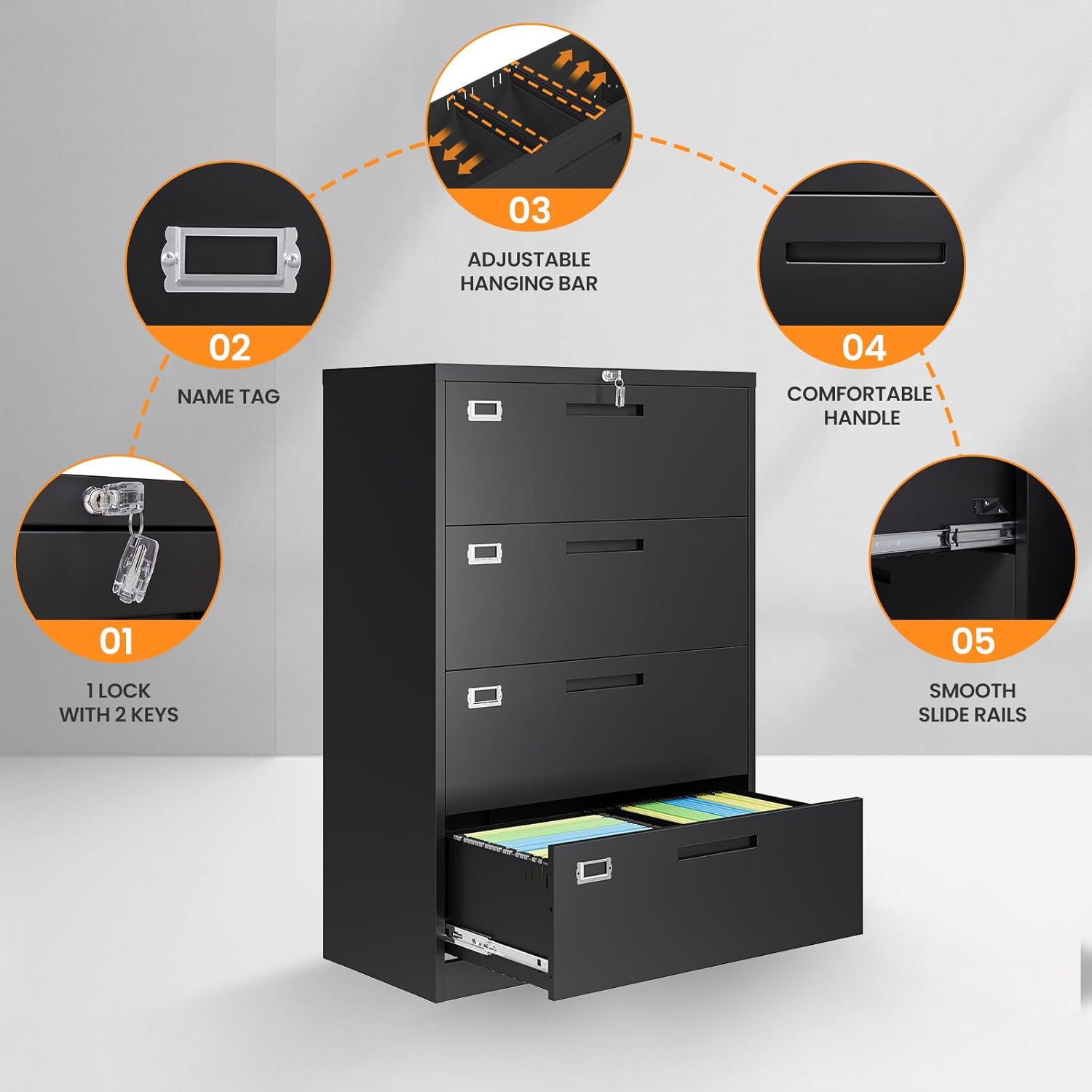 4 Drawer File Cabinets for Home Office, Metal Filing Cabinet with Lock, Black Locking File Caninet Four Drawer, Office Storage Caninets Steel Cabnet for Letter/Legal/A4/F4-Assembly Required