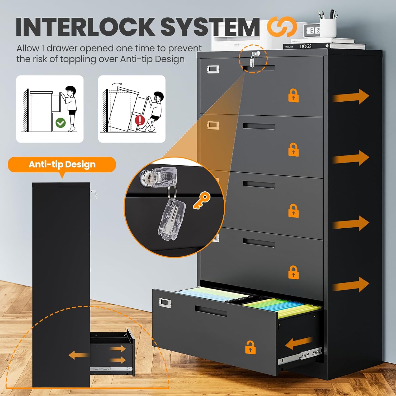 5 Drawer File Cabinets for Home Office, Metal Filing Cabinet with Lock, Black Locking File Caninet Five Drawer, Office Storage Caninets Steel Cabnet for Letter/Legal/A4/F4-Assembly Required