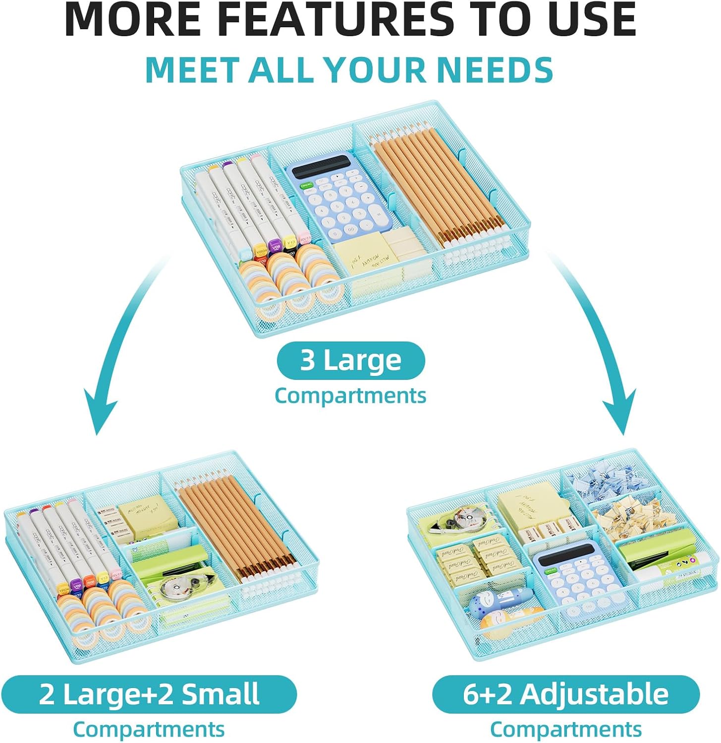 Marbrasse Desk Drawer Organizer, Metal Mesh Drawer Organizer Tray with 5 Adjustable Compartments,Desk Organizers and Accessories for Home,Office,Kitchen,Makeup,Vanity (Blue)