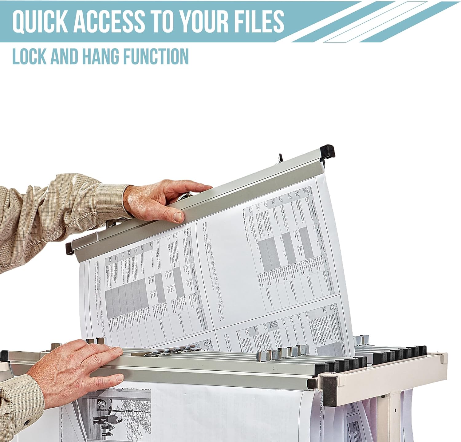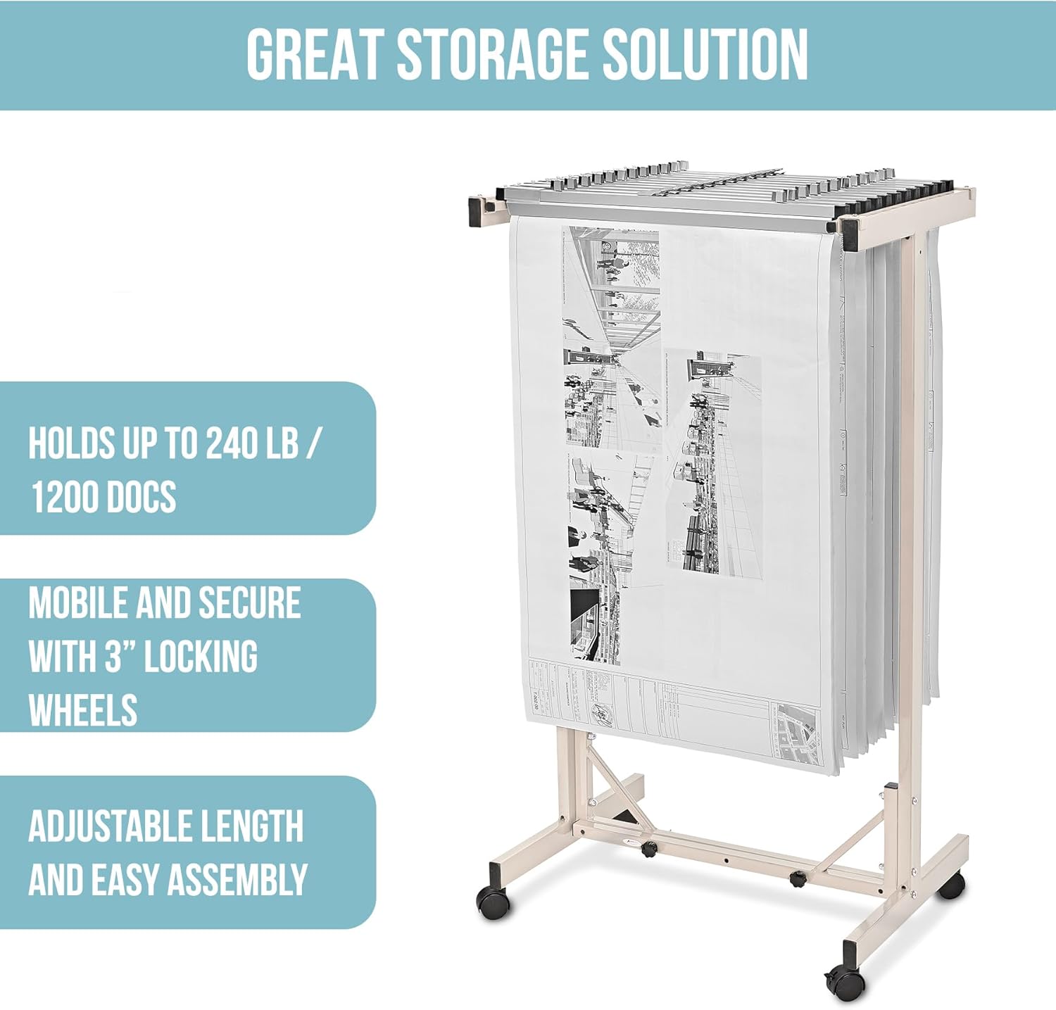 • Mobile and Adjustable Rack: The blueprint rack rolls smoothly on four casters, with front brakes for stability. Height and depth adjustments accommodate different file sizes, making it versatile for various office or job site needs.