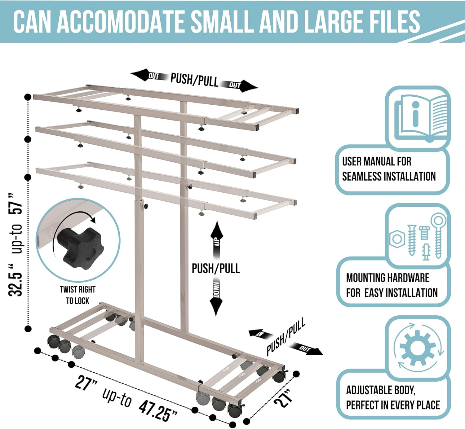 • Mobile and Adjustable Rack: The blueprint rack rolls smoothly on four casters, with front brakes for stability. Height and depth adjustments accommodate different file sizes, making it versatile for various office or job site needs.