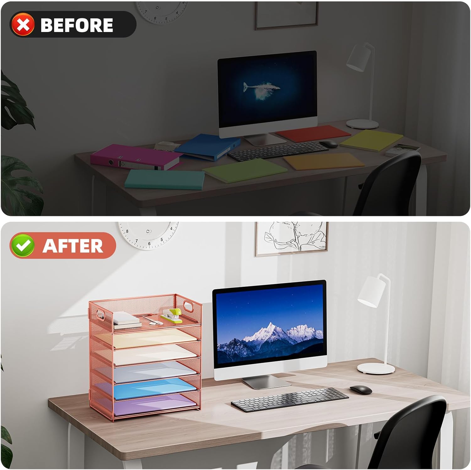 Marbrasse 6 Tier Paper Organizer Letter Tray - Mesh Desk File Organizer with Handle, Paper Sorter Organizer for Letter/A4 Office File Folder Holder - Rose Gold