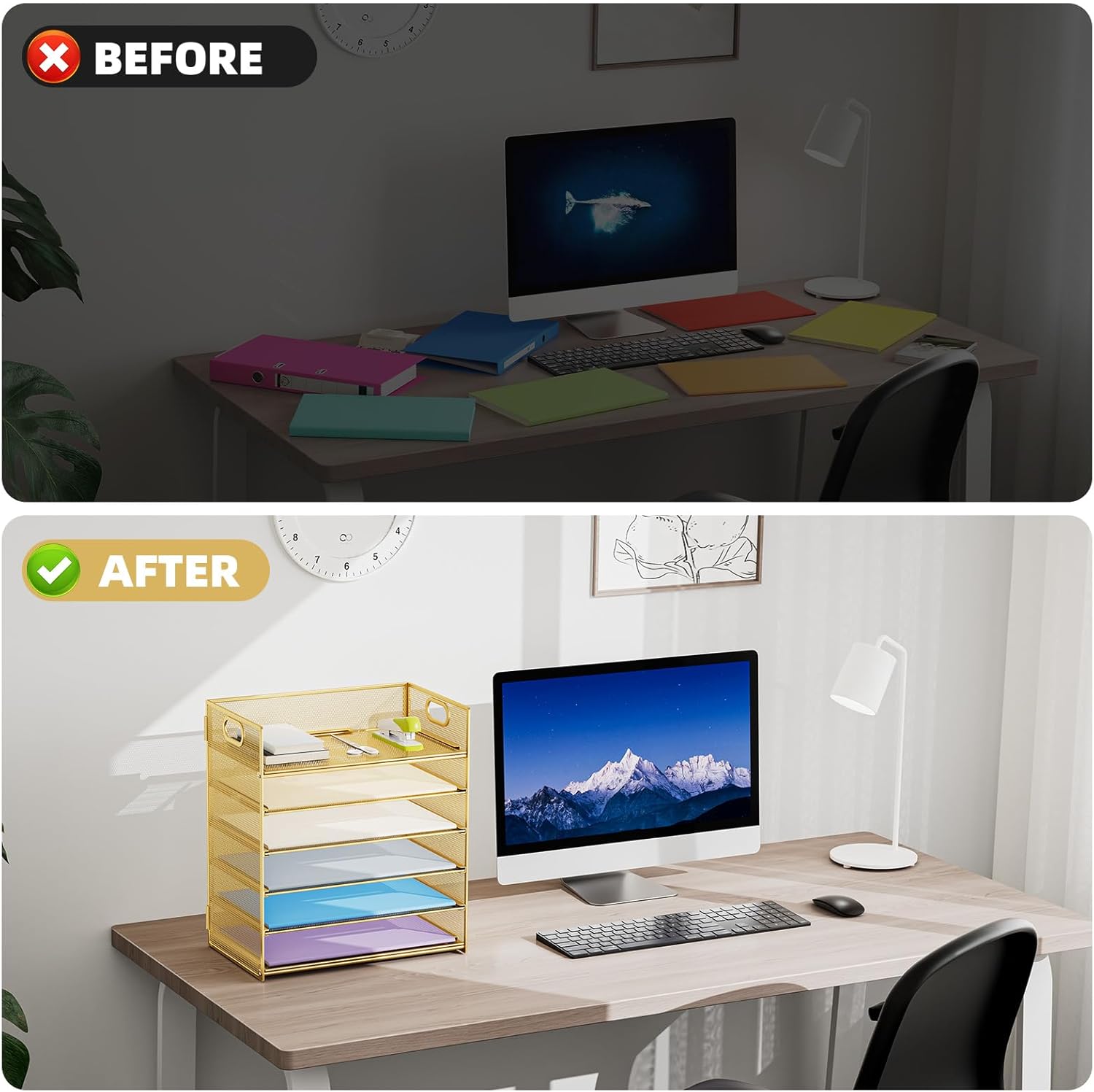 Marbrasse 2 Pack Desk Organizer with Handle, 6 Tier Paper Letter Tray, Mesh Desk File Organizer for Office, School and Home - Gold