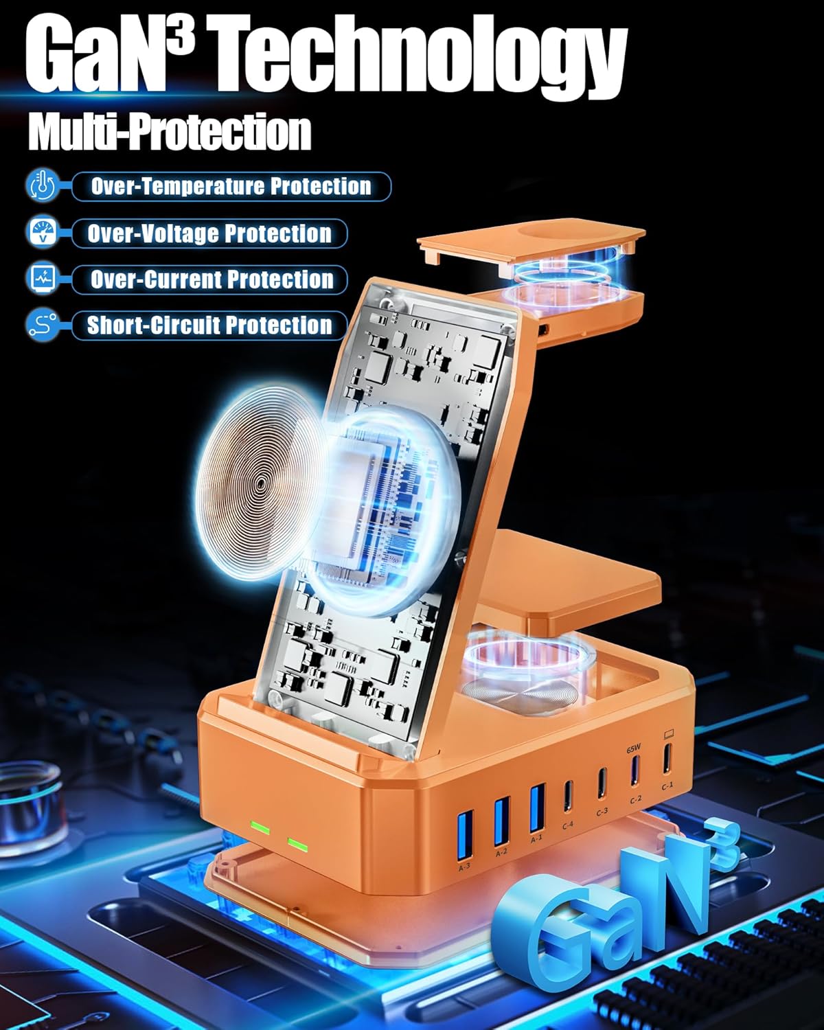 - 【Safe Charging&Multiple Protection】: Our Dual 65W PD usb c fast charger dock is equipped with the latest intelligent and efficient chipset with GaN III technology to ensure fast and safe powering of your devices. Ready to charge your Macbook series and other laptops. Our phone and watch charging station features over-current, over-voltage, over-temperature and over-charging protection. The internal circuitry is designed to prevent overcharging from damaging your device, ensuring safe charging.