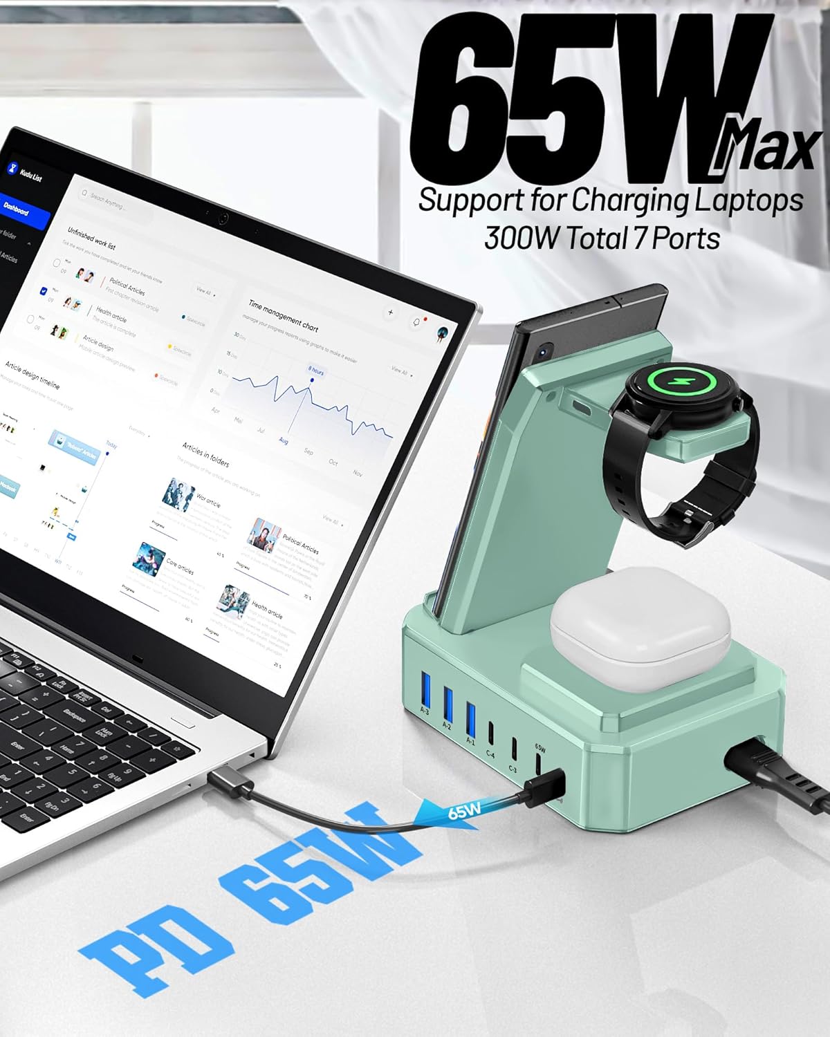 - 【300W Charging Station for Multiple Devices】: Charges up to 10 devices simultaneously.This desktop phone charging station is the perfect solution for charging multiple devices! Our charger station features 2 powerful 65W USB-C ports designed specifically for charging laptops, 2 efficient 30W USB-C ports and 3 versatile 30W USB-A ports . Samsung wireless charging station total output can be up to 300W. You can conveniently fast charge your samsung devices and other devices at the same time.