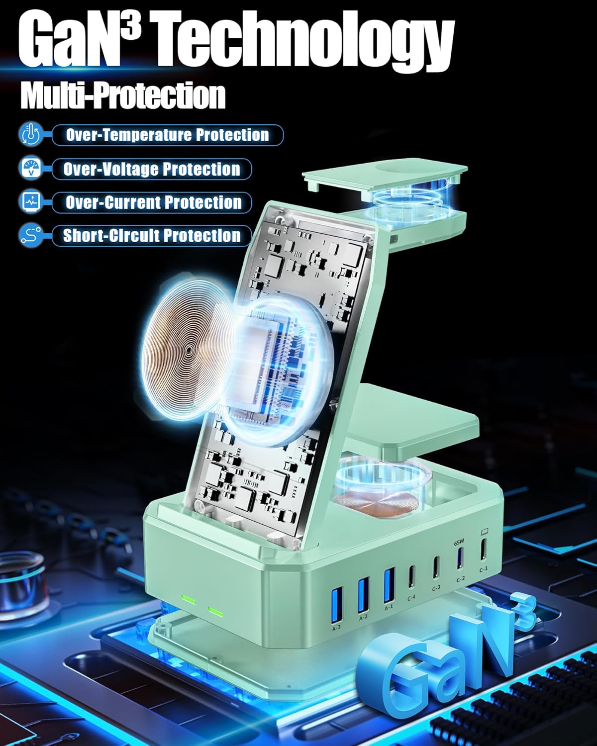 - 【Safe Charging&Multiple Protection】: Our Dual 65W PD usb c fast charger dock is equipped with the latest intelligent and efficient chipset with GaN III technology to ensure fast and safe powering of your devices. Ready to charge your Macbook series and other laptops. Our phone and watch charging station features over-current, over-voltage, over-temperature and over-charging protection. The internal circuitry is designed to prevent overcharging from damaging your device, ensuring safe charging.