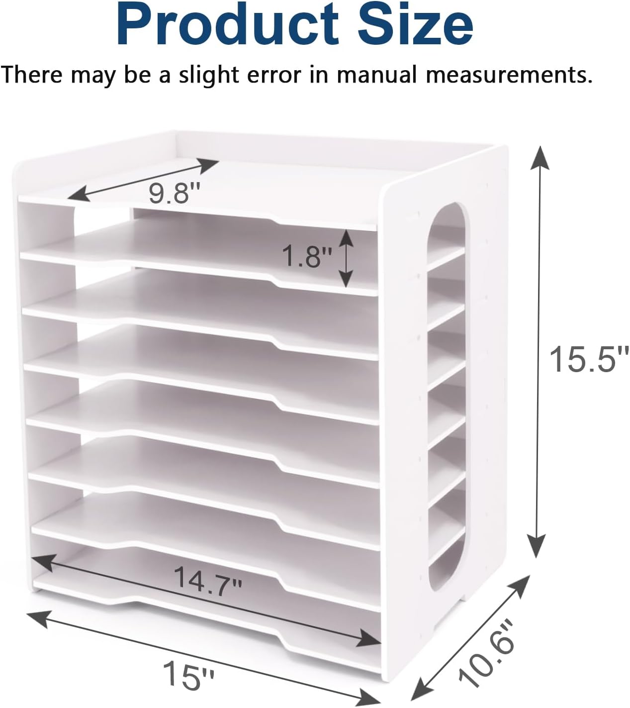- Large-Capacity Paper Organizer: This 8-tier desk organizer measures 15"W x 10.7"D x 15.5"H, with each compartment sized at 14"W x 9.8"D x 1.8"H. Designed for versatile storage, it perfectly accommodates legal-size papers (8.5" x 14"), construction documents (9" x 12"), folders, books, stationery, and notebooks. Ideal for home, office, or school use, it maximizes space efficiency while keeping your workspace clutter-free