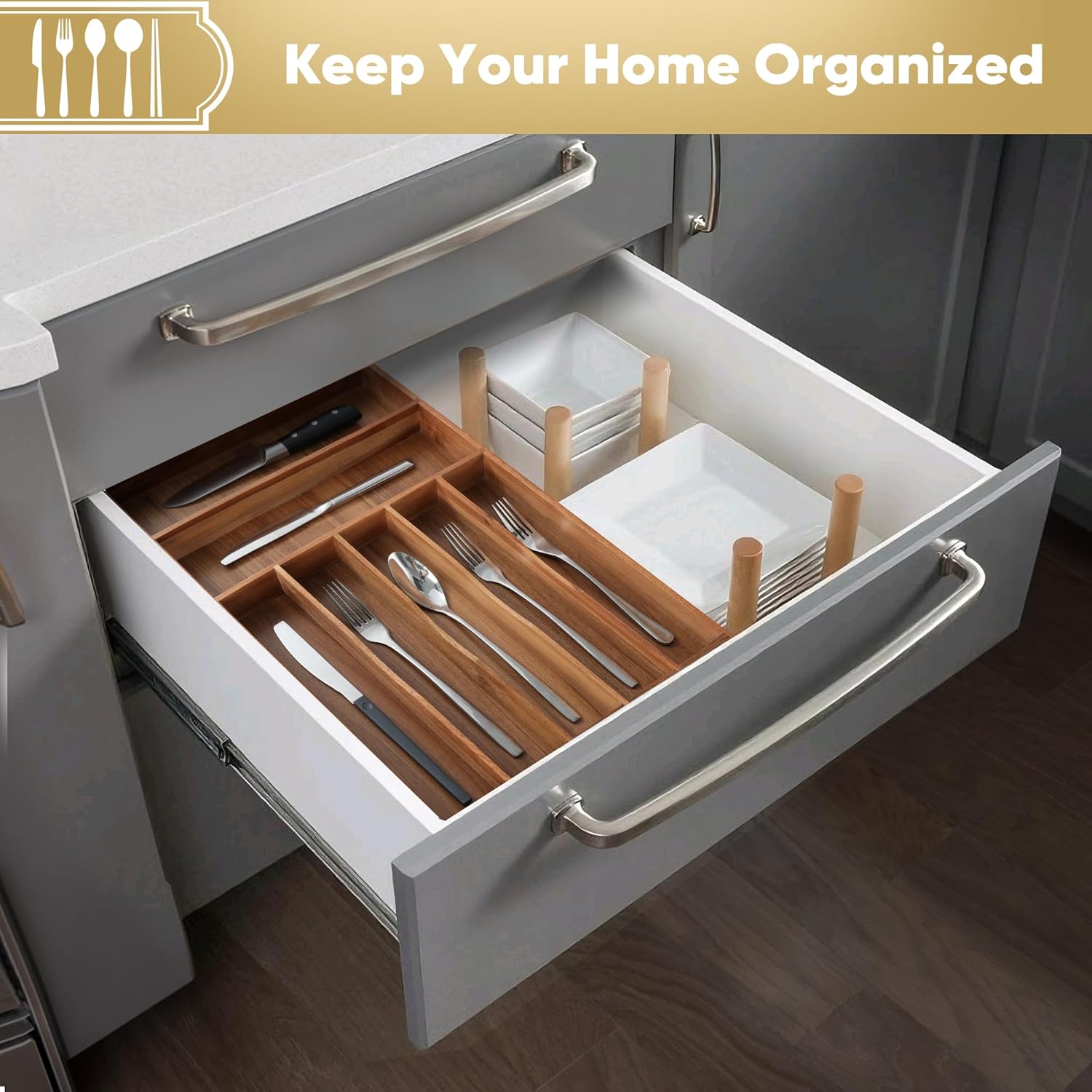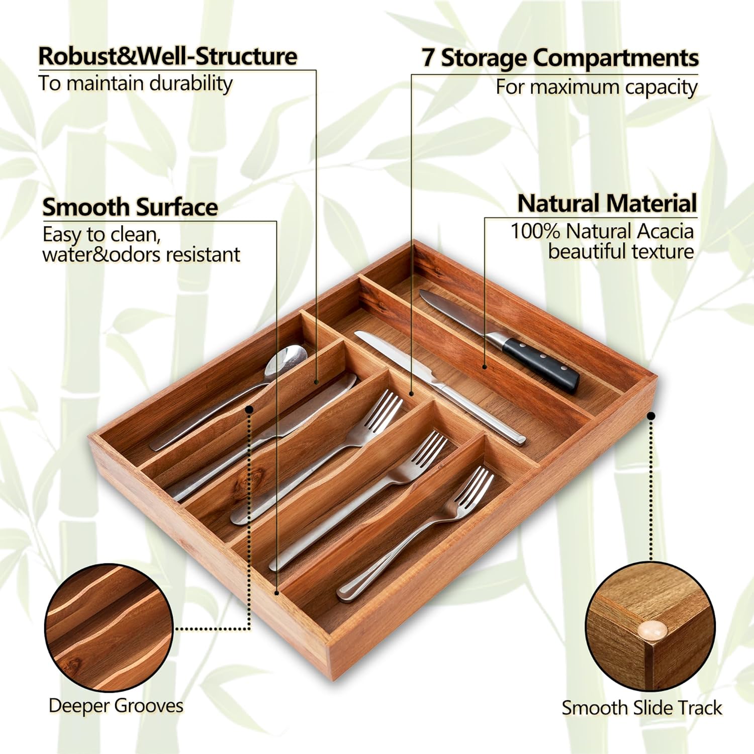 - Built to Last: Crafted from premium acacia aged 4+ years, this drawer organizer is tough enough for daily use. The eco-friendly material resists water, odors, and even knife scratches—no more unsightly marks! Unlike plastic or metal organizers, its classic, natural look shines with unique, evenly textured acacia grain that adds warmth to your kitchen.