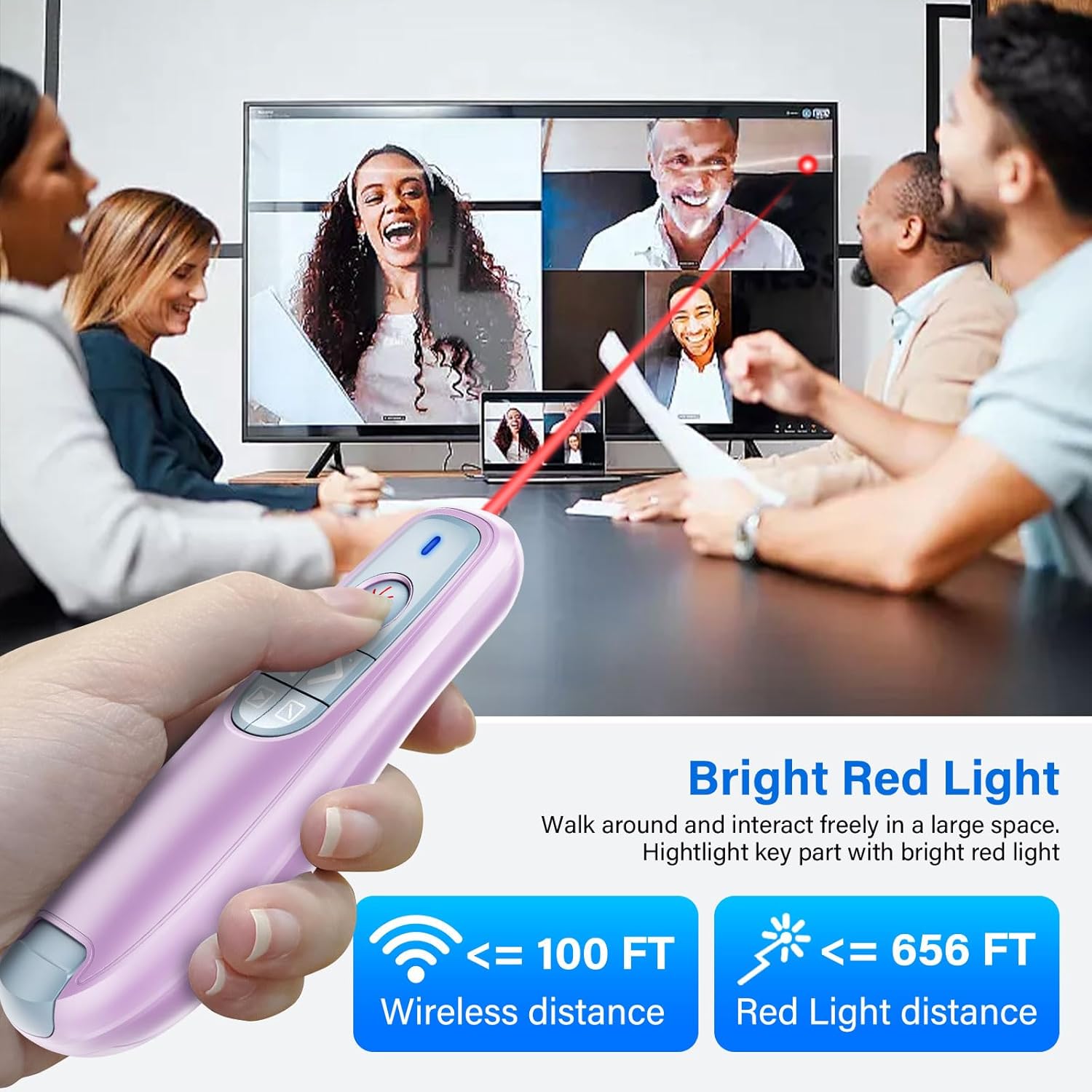 - 100FT Wireless Remote Control Distance & 656FT Light Display Range: Wireless presenter with light pointer for presentations control distance: 100FT, red light pointer range: 656FT. With this presentation clicker can allow you don't be tied to your computer. Feel free to roam around the office, classroom or auditorium while giving a presentation or lecture. This powerpoint clicker is suit for computer/laptop/mac,etc and it is a perfect toys for your pet(Not recommended for TV/LED/LCD screen)
