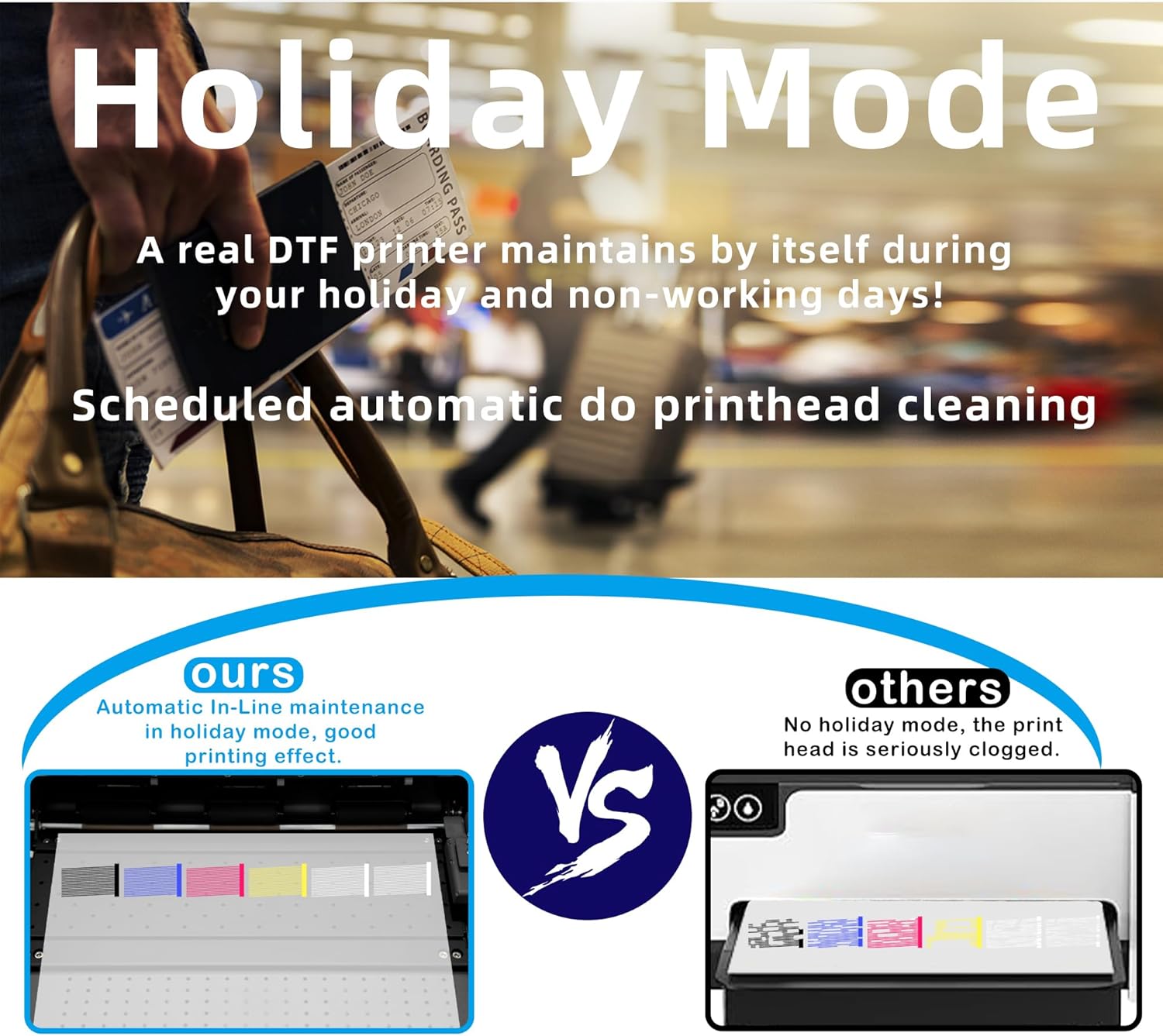 - ✅ 【Holiday Mode】 Experience worry-free operation with Smart Holiday Mode – your printer auto-maintains ink flow during breaks, vacations, or storage. Say goodbye to clogged nozzles! Engineered for entrepreneurs who value reliability and seamless restarts.