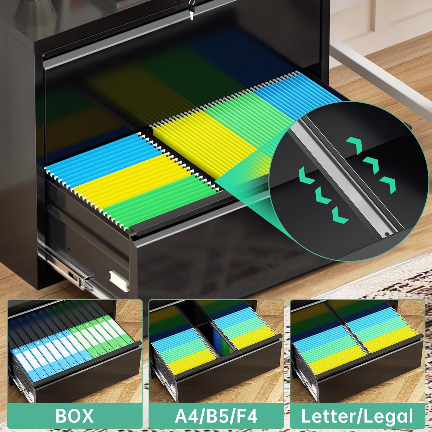 - ⤠Large Storage Space -- The 2 drawer lateral file cabinet with with adjustable hanging bars, accommodate for legal, letter, A4, F4 size hanging folders, great to keep your files, documents and other office supplies organized. Extra pads under the 2 drawer filing cabinet to prevent scratching the floor while maintaining stability.