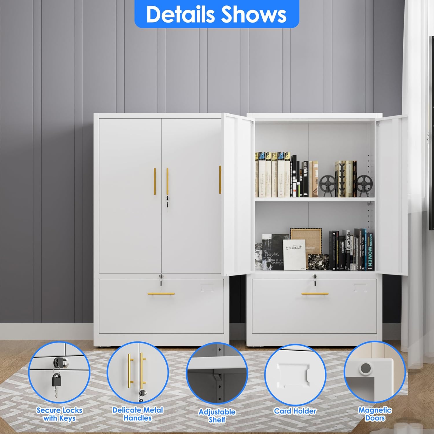- Novel and Upgraded Design for Versatile Storage: The lateral file cabinet combines a robust metal storage cabinet with adjustable shelf to accommodate items of varying heights, along with one lateral drawers featuring 2 adjustable hanging bars for seamless organization of A4, Letter, or Legal-size folders. This innovative design optimizes space and flexibility for home, office, garage, or school use;
