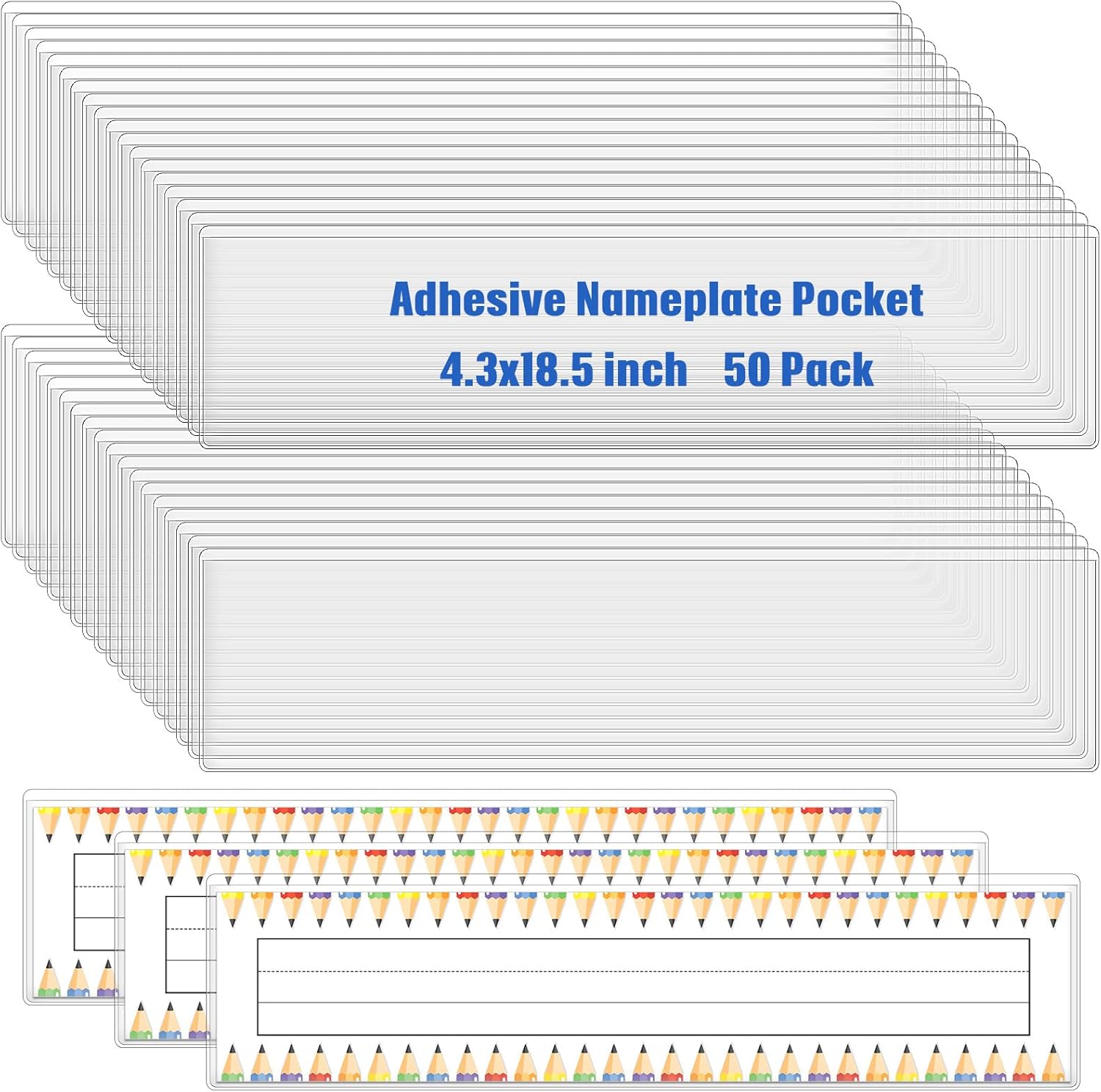 Jeyiour 50 Pcs Label Holders Adhesive Nameplate Pockets Storage Bin Labels Index Card Holder Shelf Plastic Peel Stick for Classroom Supermarket Bookshelf Library Student Box Drawer (4.3 x 18.5 Inch)