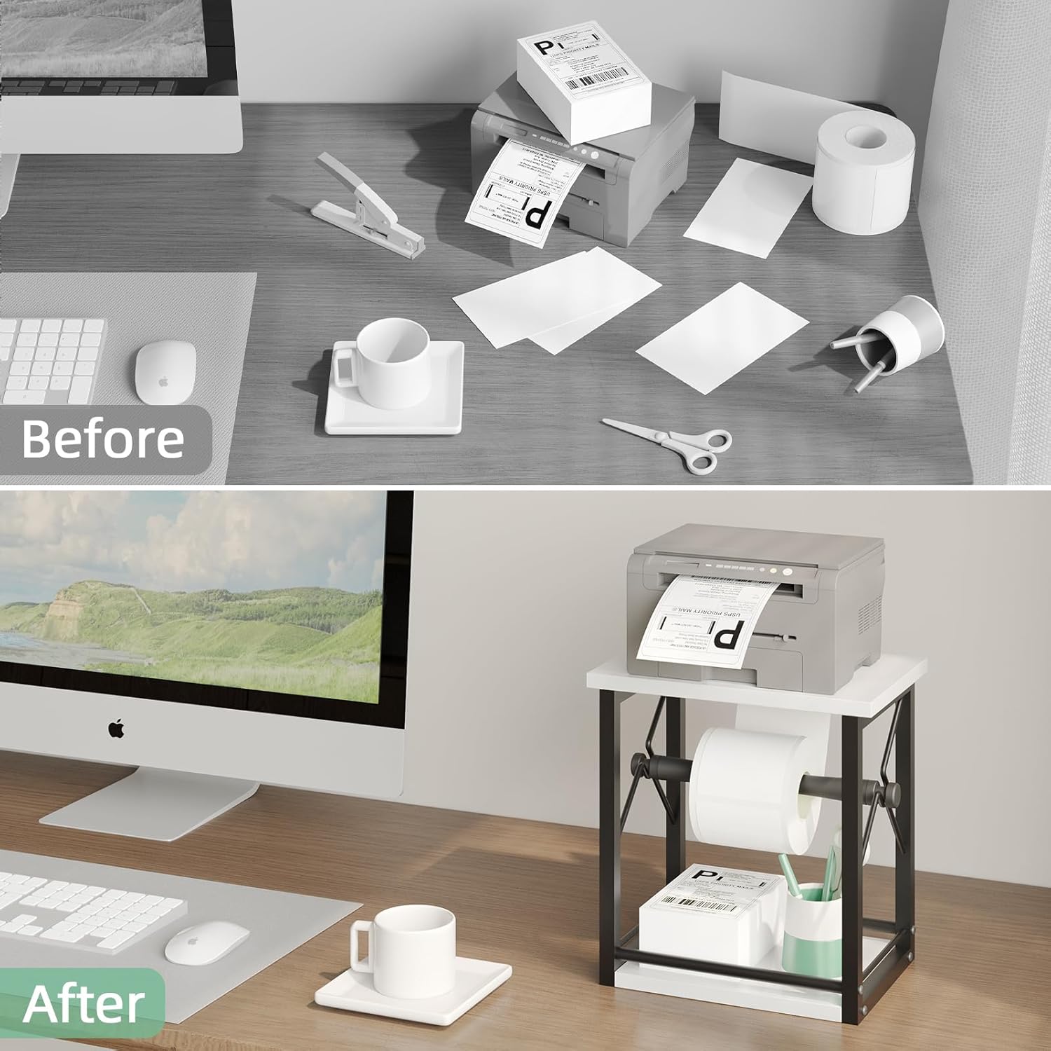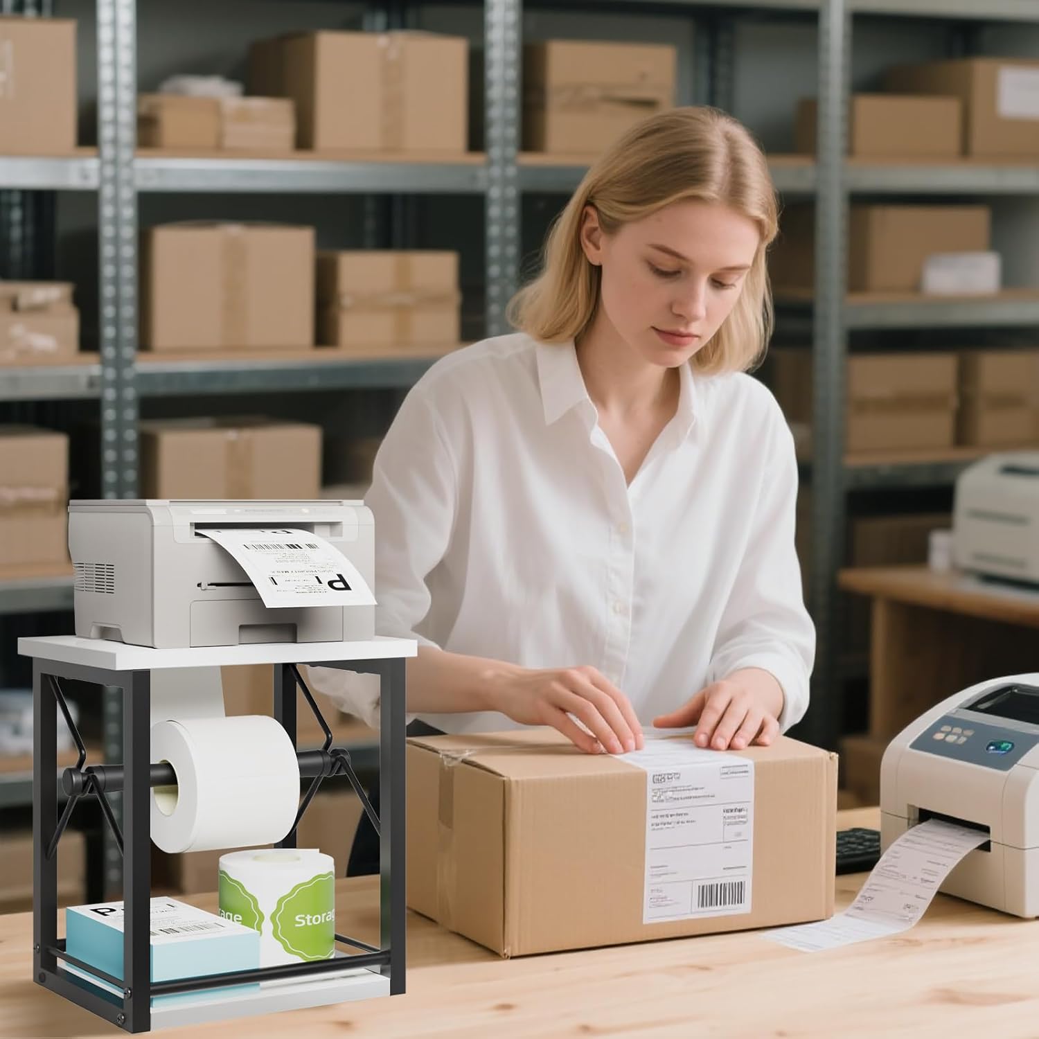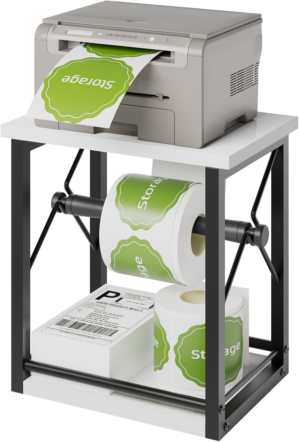 - [All-in-One Label Holder for Thermal Printers] Keep your workspace organized with this 2-tier thermal printer stand and label holder. The top accommodates most 4x6" thermal printers, the center roller serves as a label roll holder and sticker dispenser, while the bottom tray stores fan-fold labels or extra supplies. Ideal for use in shipping stations or home office setups.