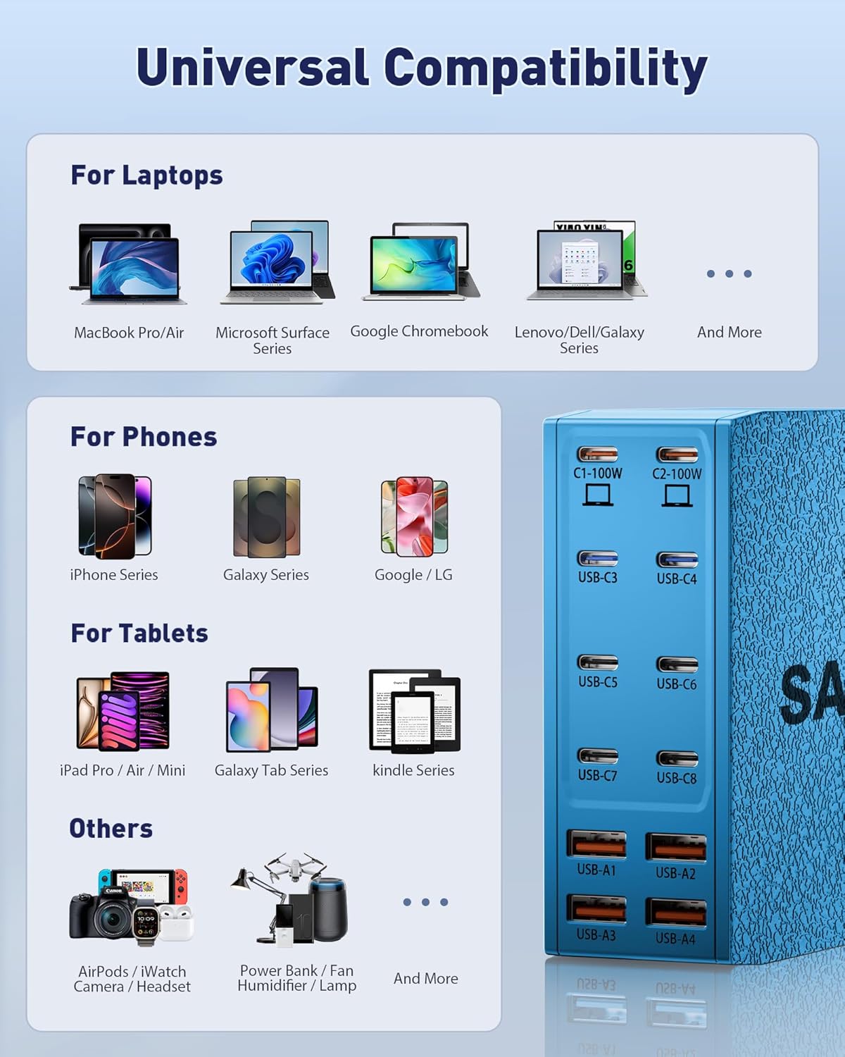 - ăUniversal CompatibilityăOur USB C charging station is equipped with 2*100W and 2*65W fast charging ports, which can charge 3 or more laptops at the same time. Compatible with smartphones, tablets and laptops, suitable for MacBook Pro/Air, Dell XPS, iPad Pro, Phone 16/16 Pro Max, Phone 15 Pro Max, Phone 14/13 Pro/12 Pro Max, iWatch, AirPods, Surface Pro, Galaxy S24 Ultra, Switch, Steam Deck, Google Pixel and many other devices.