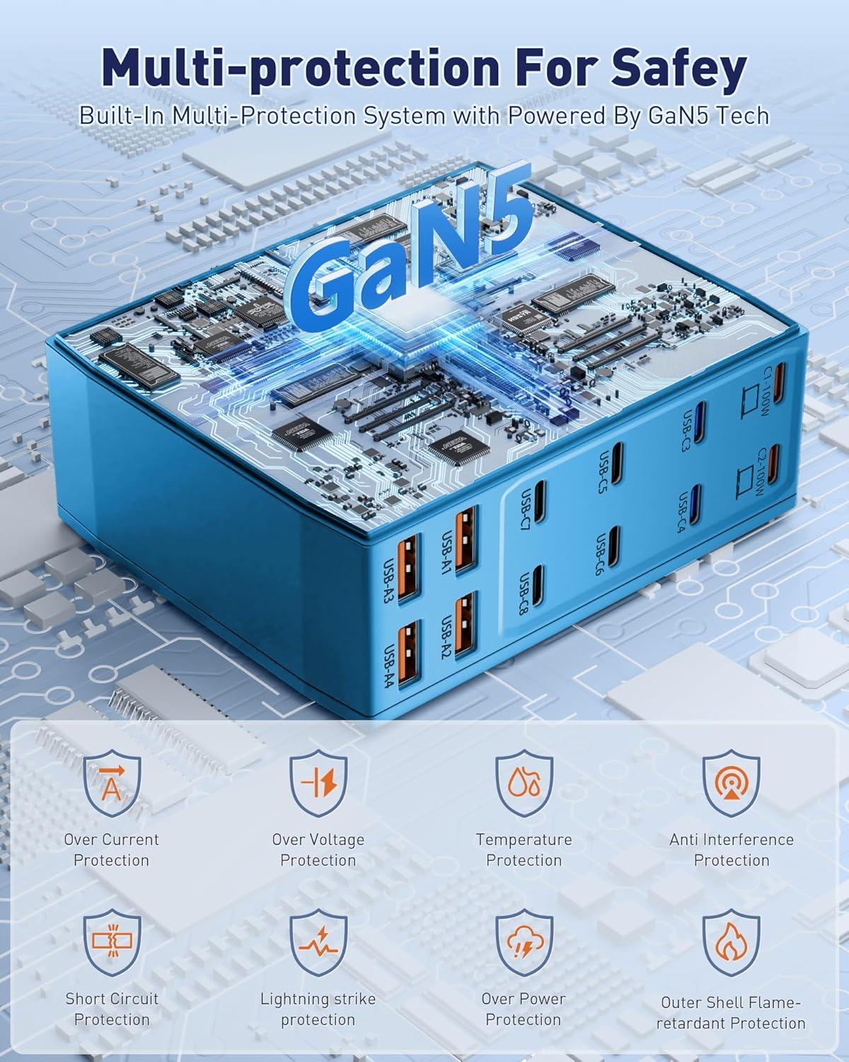 - ă12-in-1 USB C Charging StationăThis 600W USB C Charger Block comes with 8 USB C ports and 4 USB A ports to charge multiple devices, simplify your charging setup, and let you experience the convenience of ultra-fast and ultra-high output charging. With its smart charging technology, it can automatically detect and provide the best power output for each connected device, ensuring fast and efficient charging.