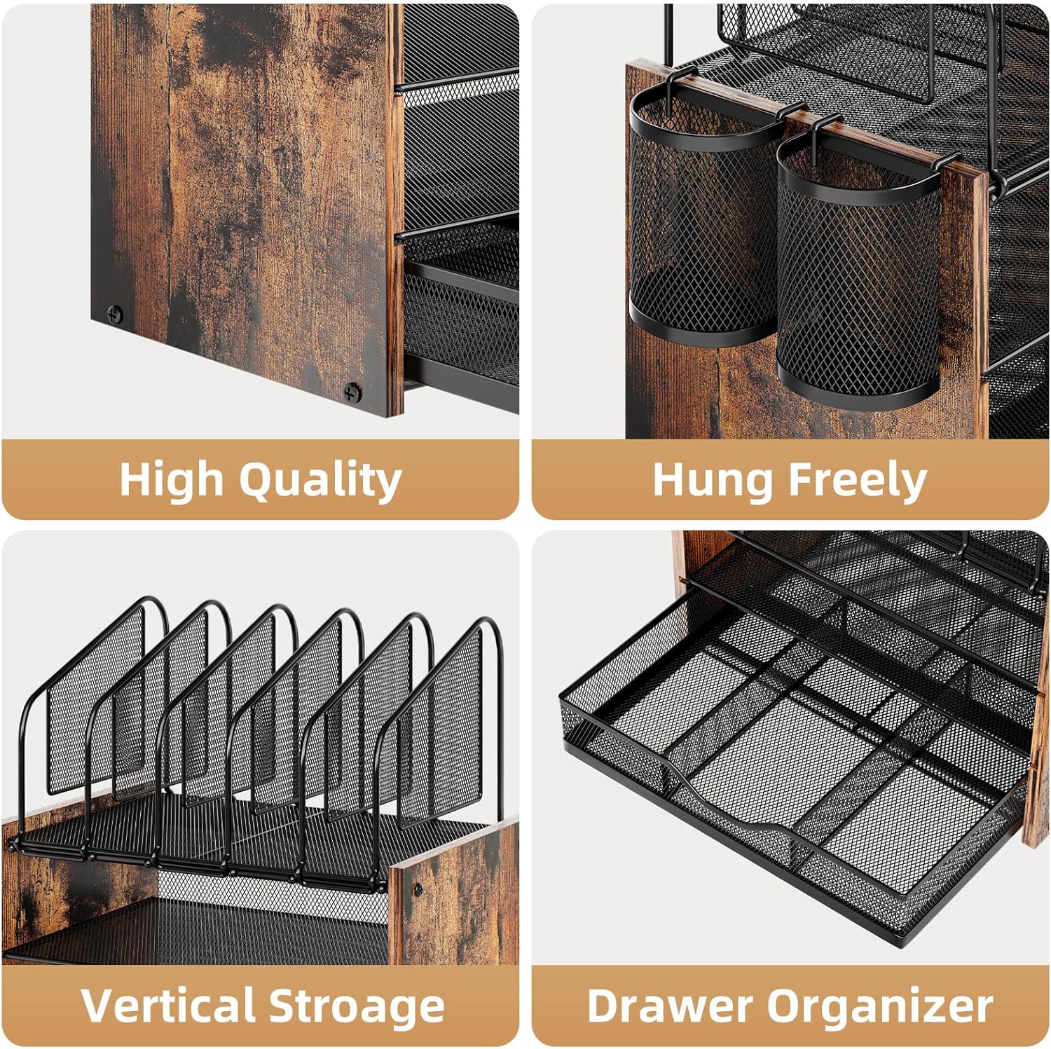 - 【Multifunctional Desk organizer】Our upgrade desktop file organizer has vertical and horizontal storage space – 4 Tiers +5 vertical sorters +3 compartments drawer+ additional 2 pen holders . Upright section has five 2" Compartments for magazines, bill, file, book. Three types of use to meet your various office needs!!