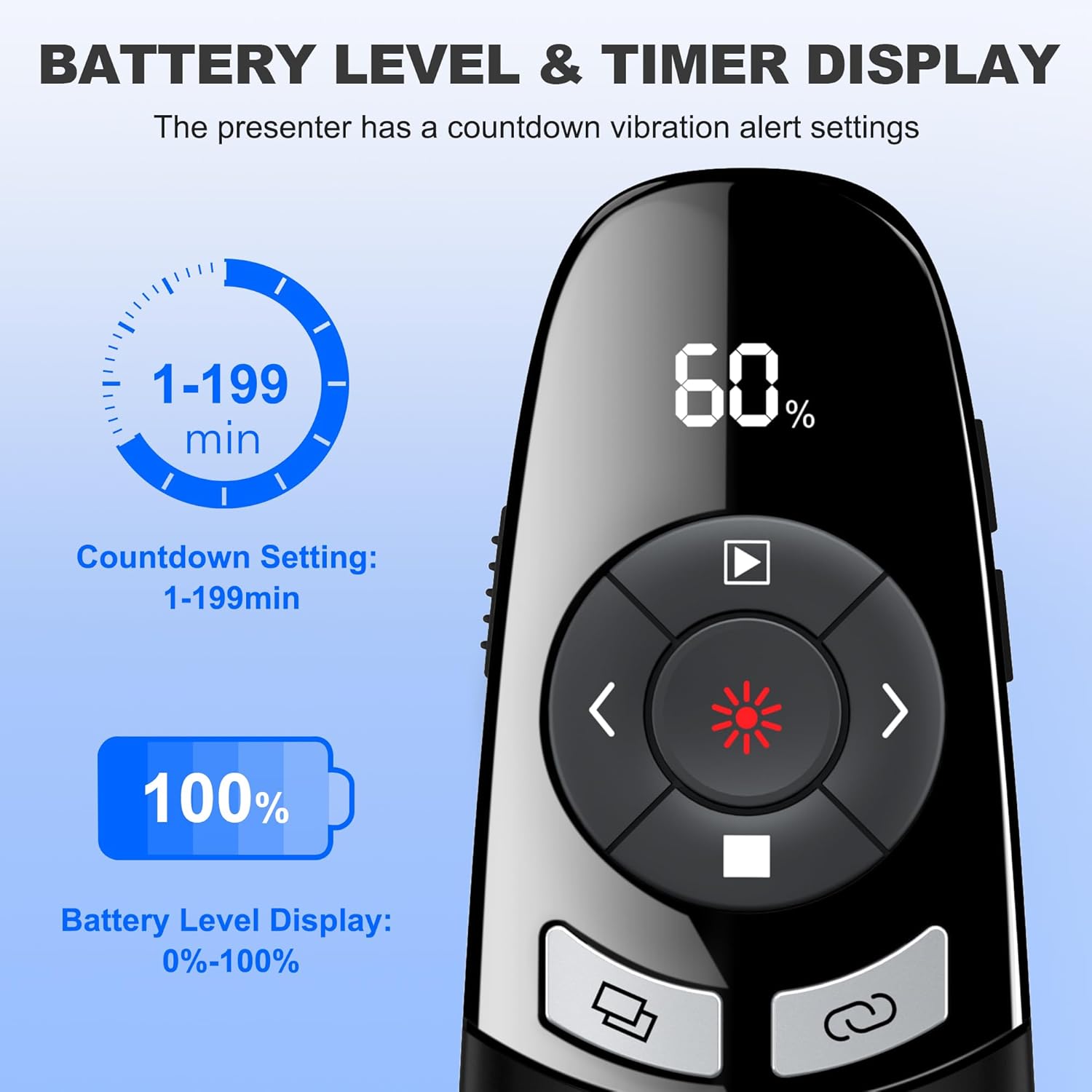 - 【BATTERY & TIMER DISPLAY】The display of clicker for powerpoint presentations will show the battery level, the LED light will flash in green to remind low battery if less than 20%. Charging the presentation clicker in time, you won't miss any important presentations. And The laser pointer for presentations has a countdown vibration alert settings, the time can be set between 1-199 minutes, so that you can control the time precisely